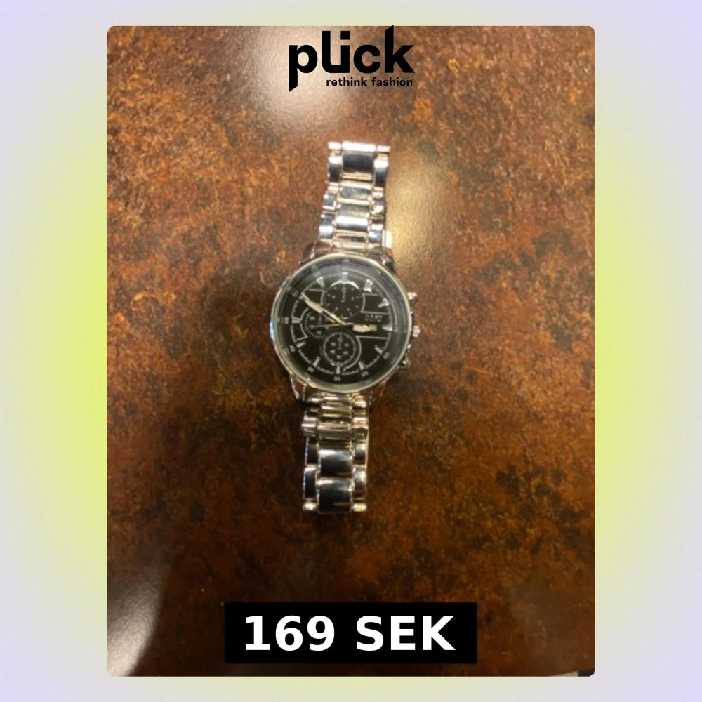 Snygg kronografklocka med svart urtavla och flera små visare. Armbandet är i blankt silverfärgat metall med robust länkkonstruktion och smidig låsning. Klockan har rund form och detaljerade markeringar på urtavlan, perfekt för dig som gillar klassisk men modern stil. 14-17Cm