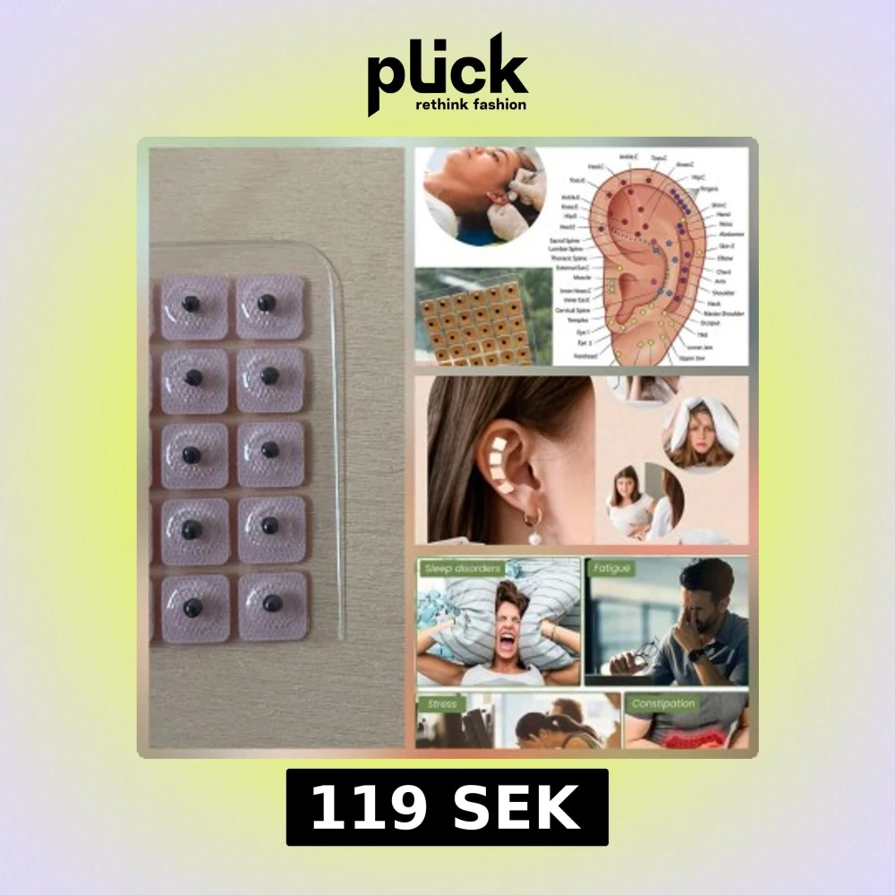 Kit för öronfröterapi med små frön fästa på plåster. Används för att stimulera olika punkter på örat enligt akupunkturprinciper. Inkluderar flera plåster och en applikationspinne. Kan hjälpa vid stress, sömnproblem och trötthet.