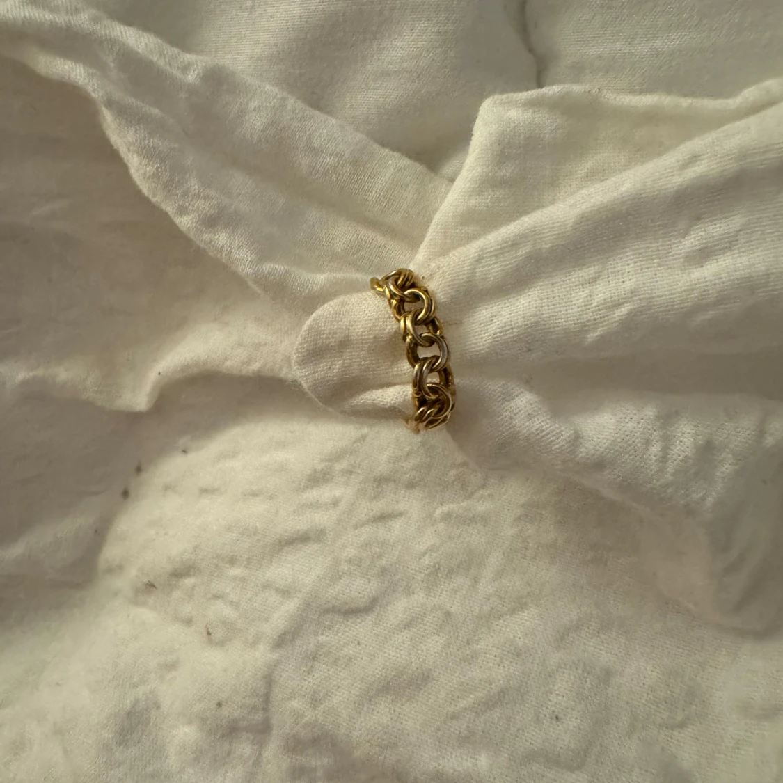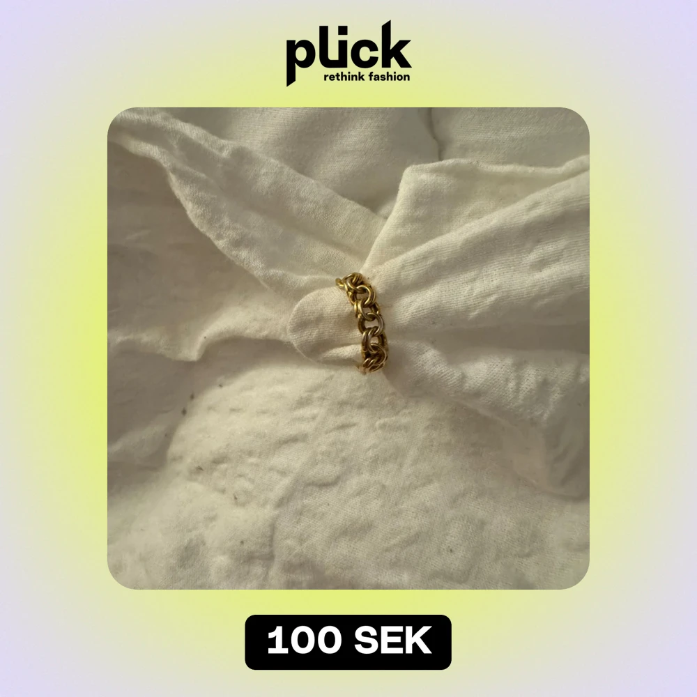 Säljer en snygg guldfärgad ring med en unik kedjedesign. Perfekt för att ge din outfit en cool och trendig touch. Ringen är i mycket bra skick och passar till både vardag och fest. Ett måste för alla som älskar stilrena smycken!