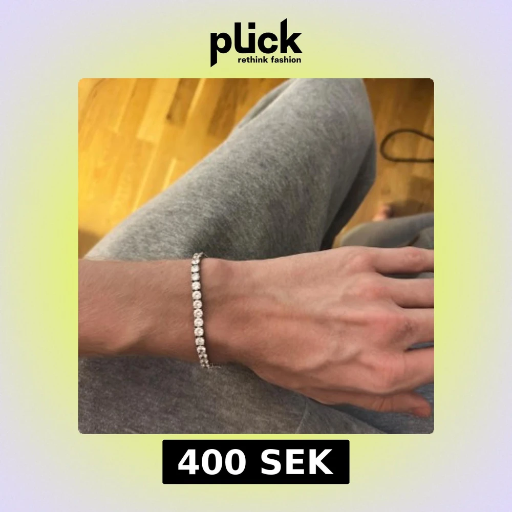 Säljer ett stilrent tennisarmband i silverfärg med gnistrande stenar längs hela bandet. Armbandet har klassisk design och ger en lyxig känsla med sina tätt sittande, runda stenar som reflekterar ljuset snyggt.