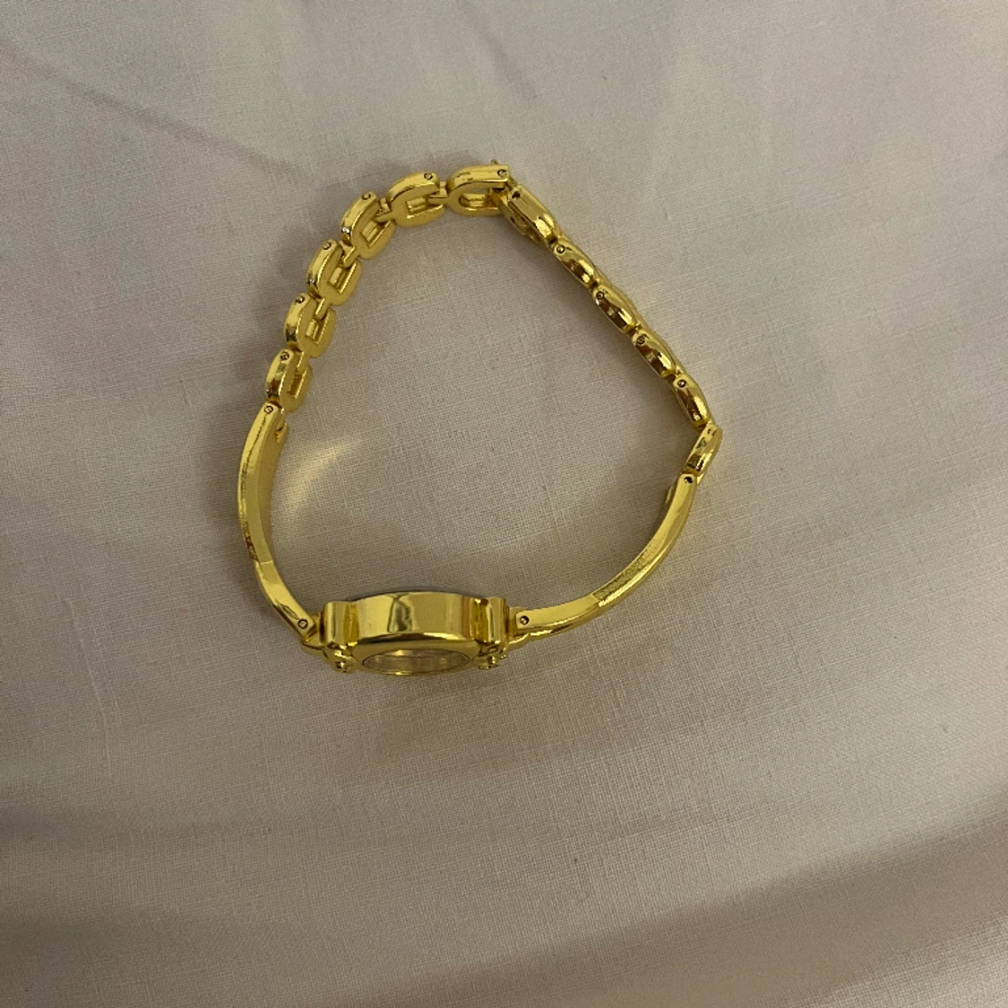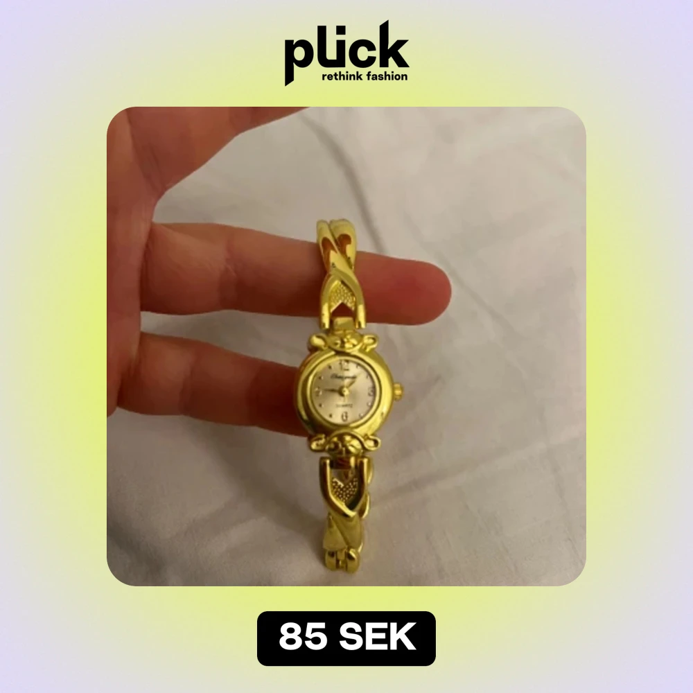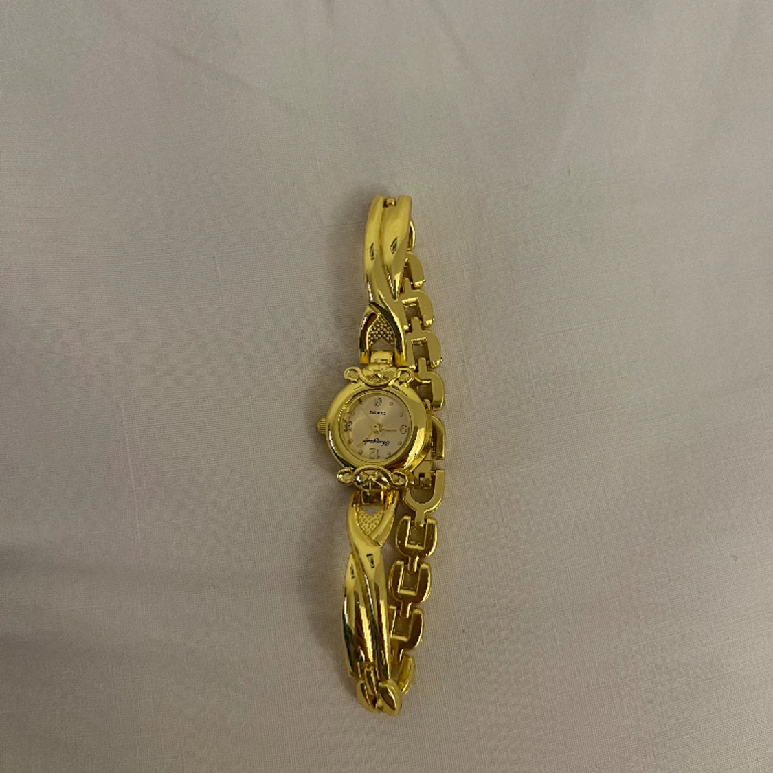 Klocka i guld tillverkad av rostfritt stål. Ej testad då den var för stor. Batteri behövs men fin även som acessoar💖