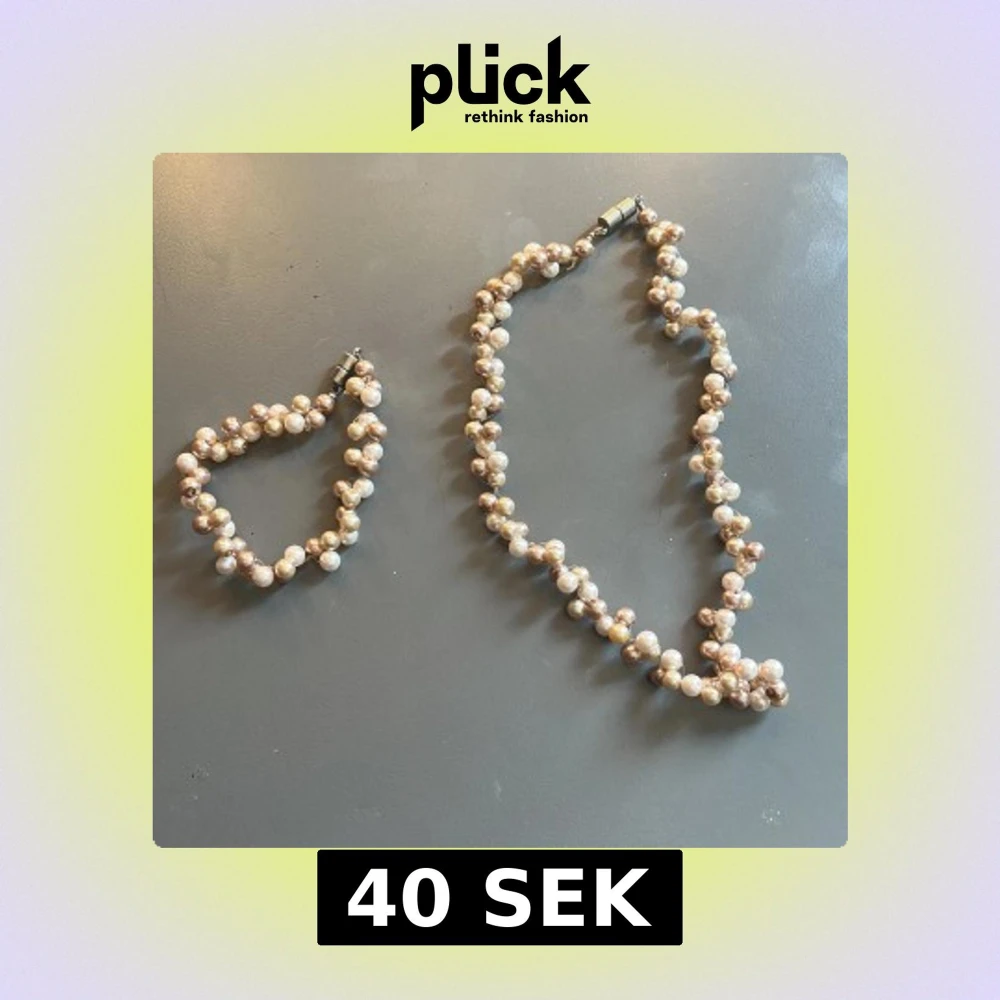Säljer ett matchande set med halsband och armband av glansiga pärlor i guld- och champagnefärg som jag själv har pärlat. Båda har ett tvinnat mönster och magnetlås i silverfärg. Armbandet är 20cm.
