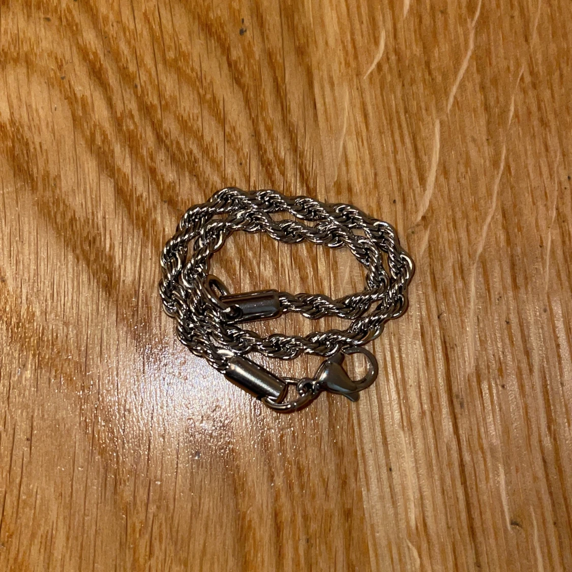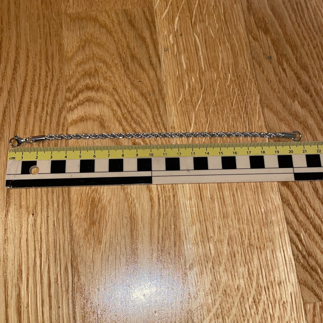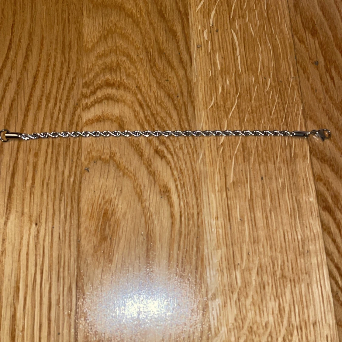 Snyggt armband i silverfärg med flätad kedja och karbinhake. Perfekt accessoar för att lyfta din stil med en clean och modern look. Längden är cirka 21 cm och armbandet har en diskret men cool design som passar till det mesta. PRIS KAN DISKUTERAS VID SNABB AFFÄR!