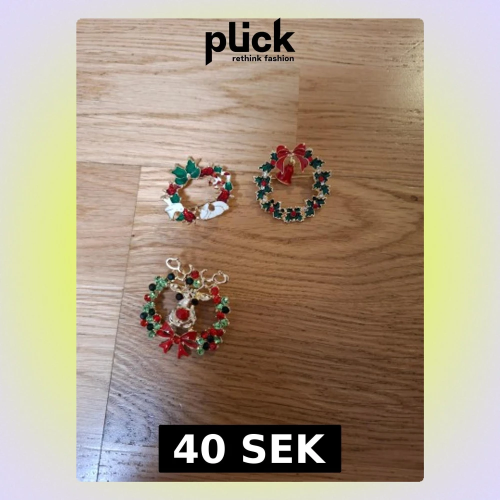 Säljer tre snygga broscher med julkransmotiv i metall. En har en ren med röda och gröna stenar, en har vita detaljer och grön rosett, och en har en stor röd rosett med klocka. Perfekt för att maxa julstilen! Färgerna är röd, grön, vit och guld.