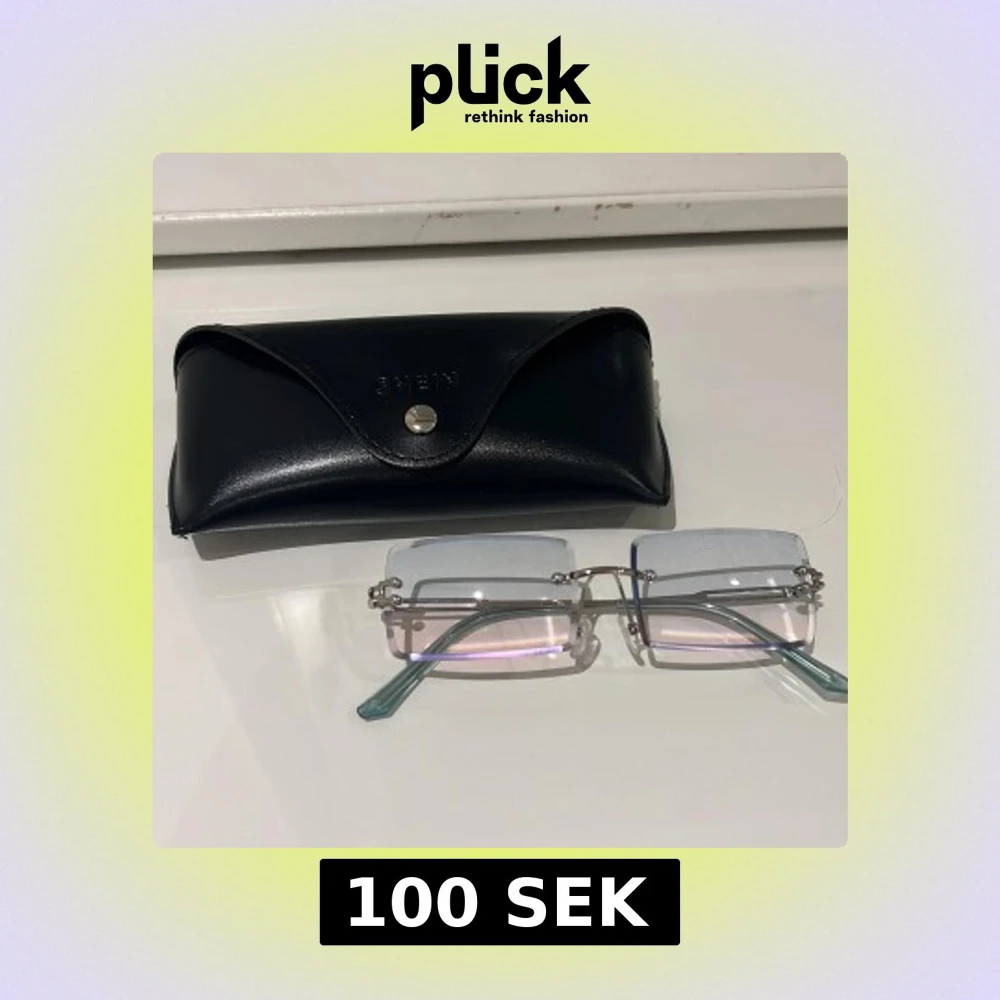 Säljer tre par glasögon från SHEIN: ett par rektangulära med transparenta blåtonade glas och silverdetaljer, ett par rektangulära med färgskiftande blå-rosa glas och gulddetaljer, samt ett par stora åttakantiga solglasögon med bruna glas och gulddetaljer. Alla med svarta fodral.