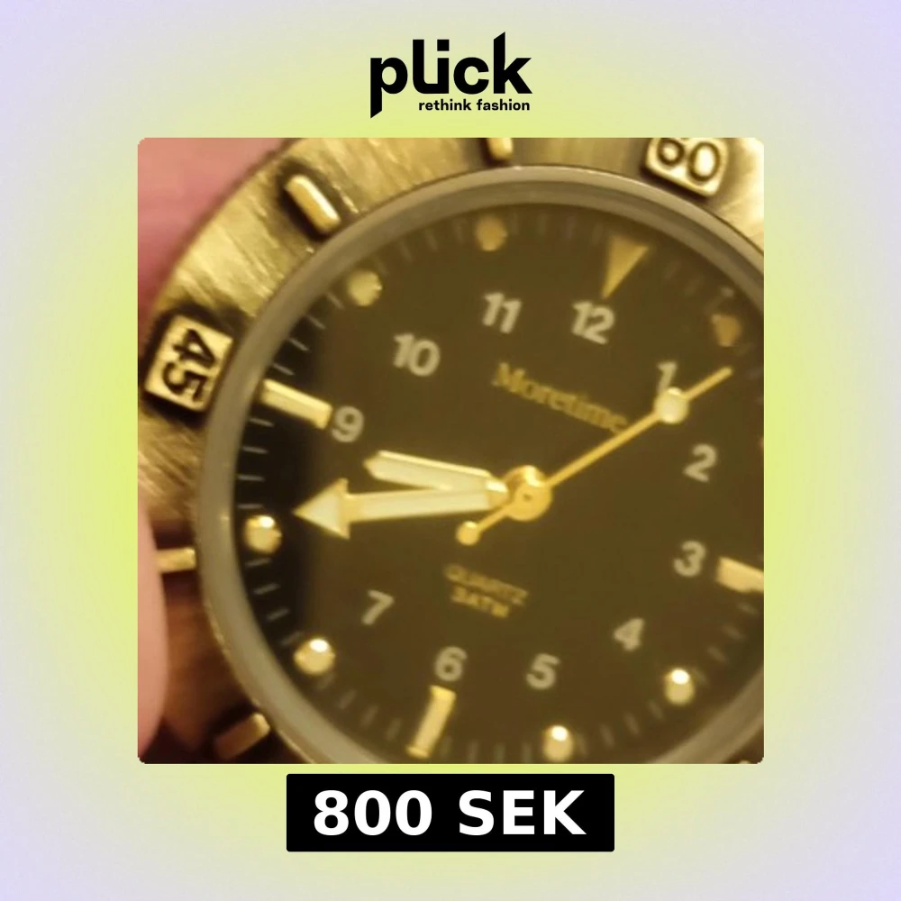 Stilren klocka från Moretime med svart urtavla, guldiga visare och detaljer. Boetten är guldig och har markerade siffror på ringen. Klockan har ett brunt läderband som ger en klassisk look. Quartz-urverk och tydliga indexmarkeringar. Nytt batteri behövs.