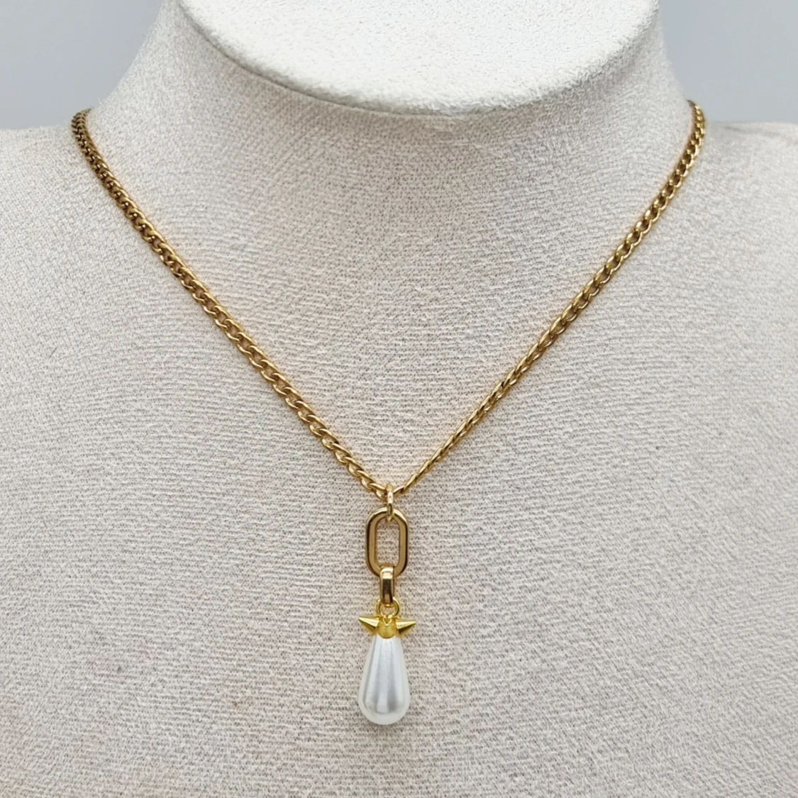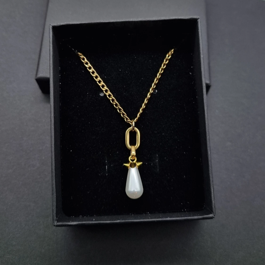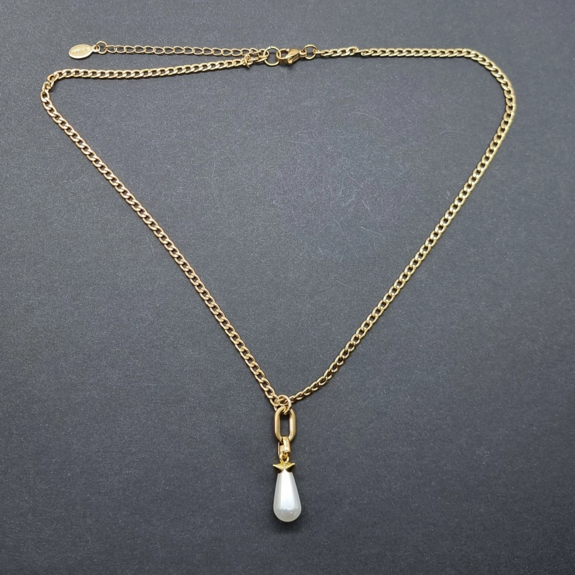 Stilrent halsband i guldton med en kedja och ett hängsmycke i form av en vit, droppformad pärla.