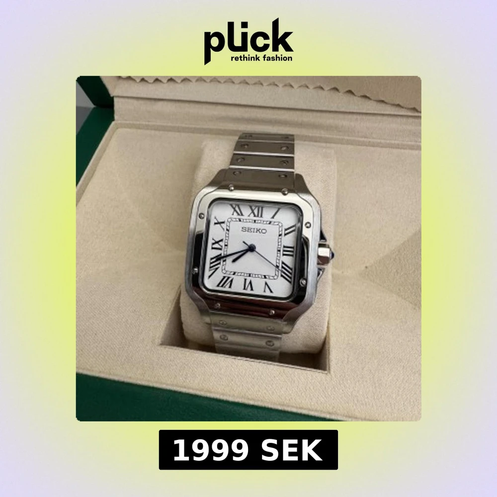 Snygg Seiko klocka med fyrkantigt boett i silverfärgat stål och matchande länkarmband. Urtavlan är vit med svarta romerska siffror och blå visare, samt en cool transparent baksida som visar mekanismen. Kronan har en blå detalj som sticker ut.