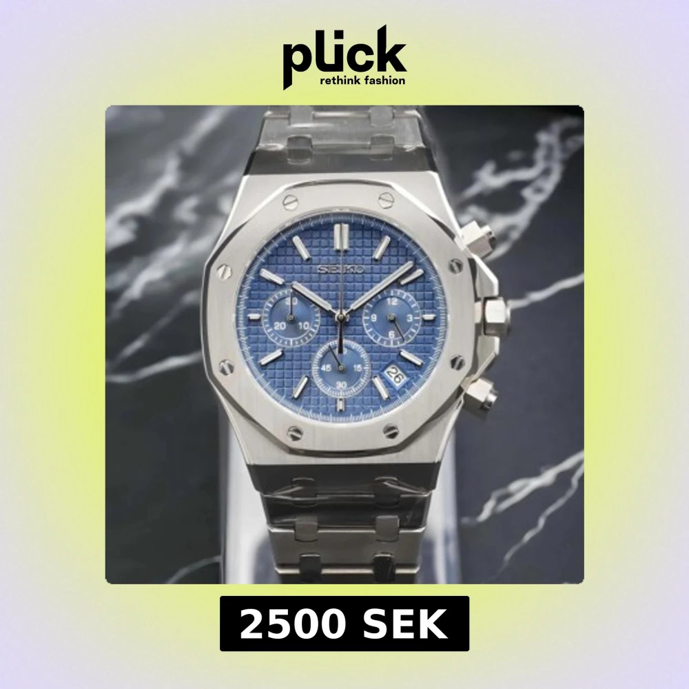 Snygg Seiko kronograf med blå urtavla och rutmönster. Klockan har robust armband och boett i silverfärgat stål, oktagonal form och flera subdials. Perfekt för dig som gillar stilren design med sportig touch. Datumvisning vid kl 4 och tydliga indexmarkeringar.