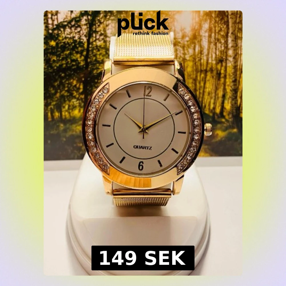 Stilren guldig klocka från Quartz med mesharmband i metall och glittrande stenar runt urtavlan. Urtavlan är ljus med minimalistiska markeringar och guldfärgade visare. Perfekt accessoar för att lyfta din outfit. Rustad med nytt batteri!