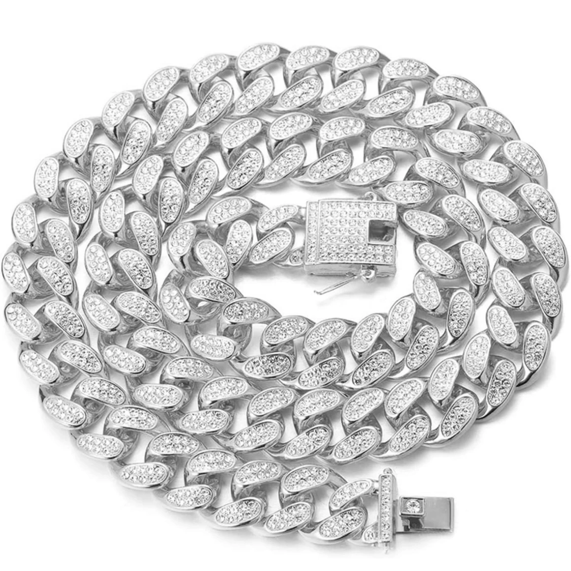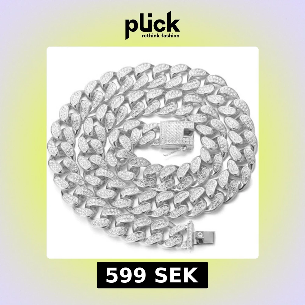 Snyggt och glittrigt halsband i silverfärg med stora länkar täckta av gnistrande stenar. Perfekt för att ge en extra touch av glamour till din outfit. Låset är fyrkantigt och dekorerat med små stenar för en lyxig känsla.