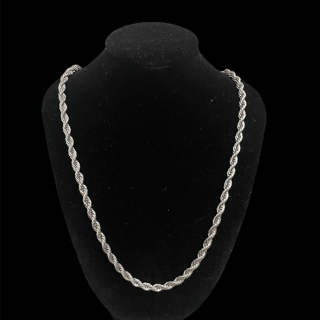 rostfri/silverplaterad. 5mm och 50 cm långt vilket är en parfekt längd om du inte vill den ska va för lång eller för kort. Vid fler frågor är det bara att skriva till mig privat.