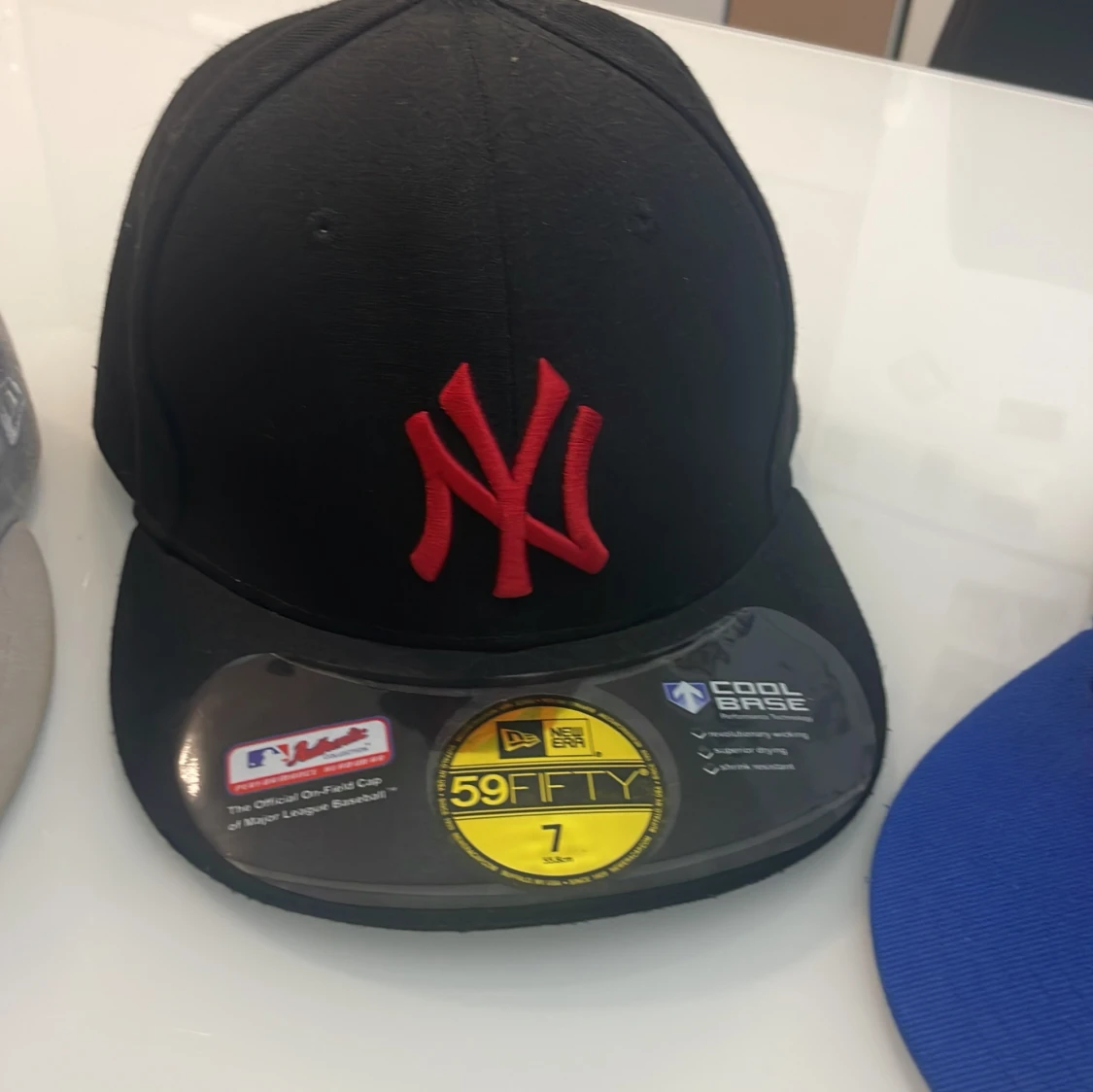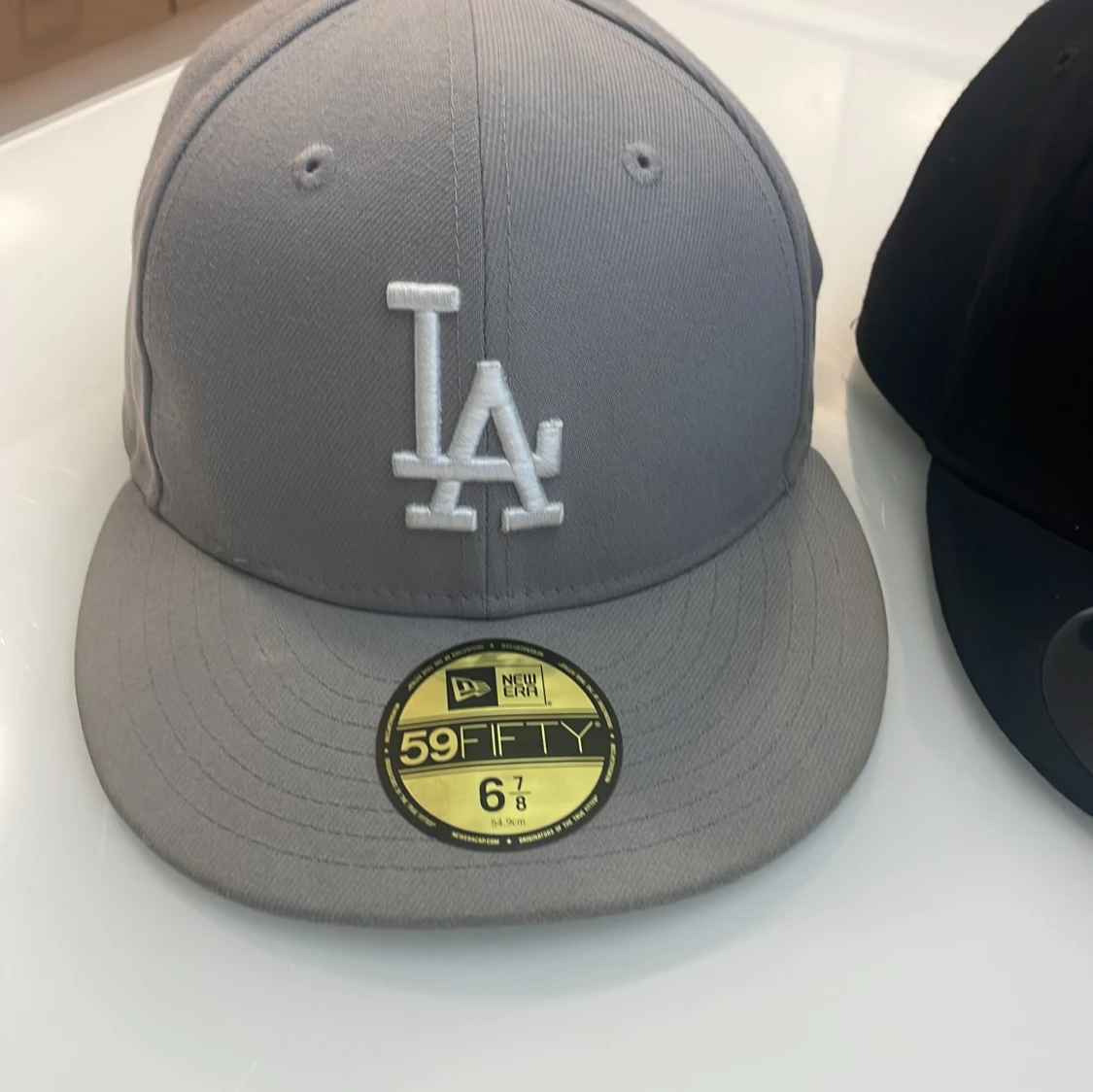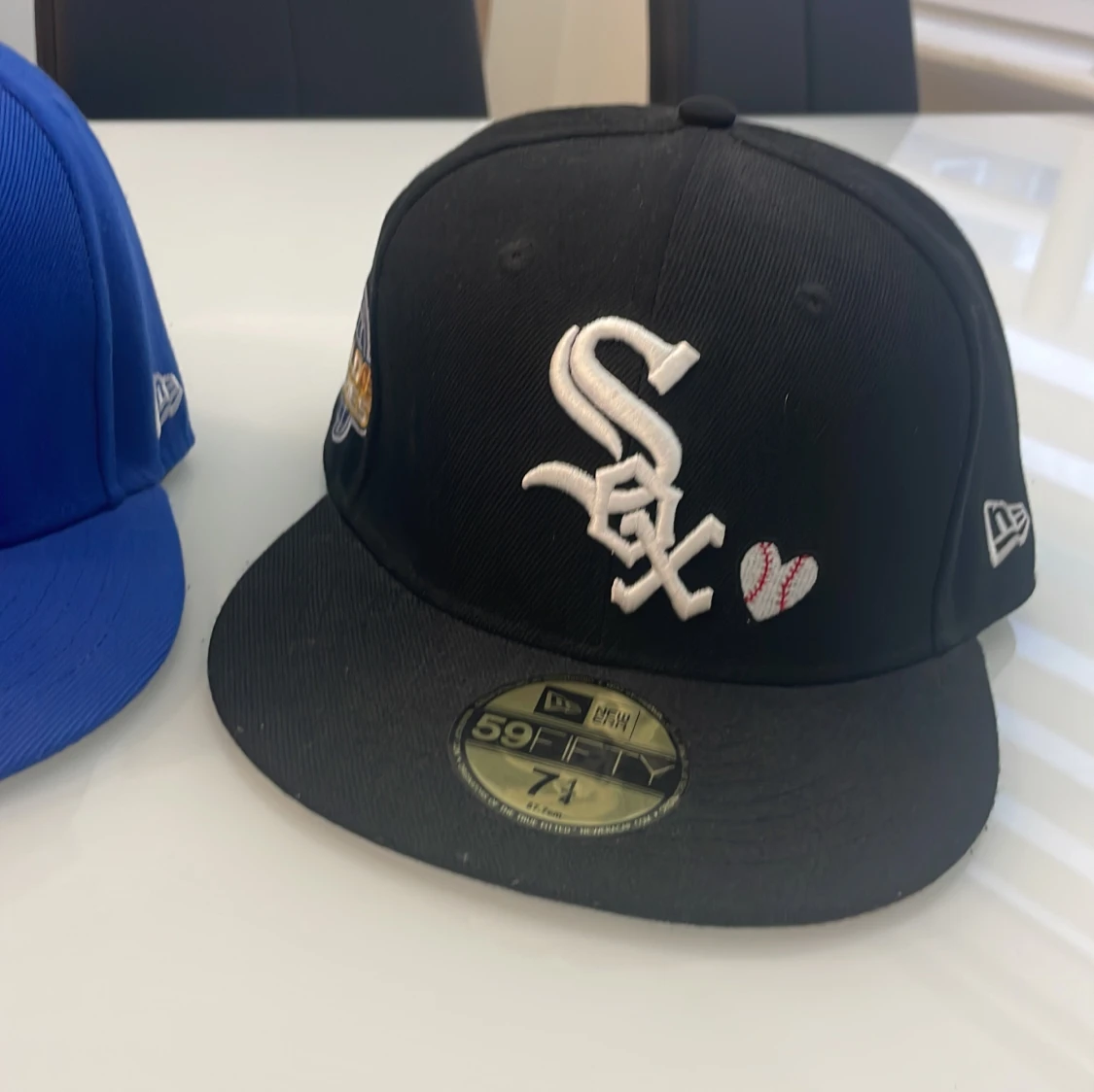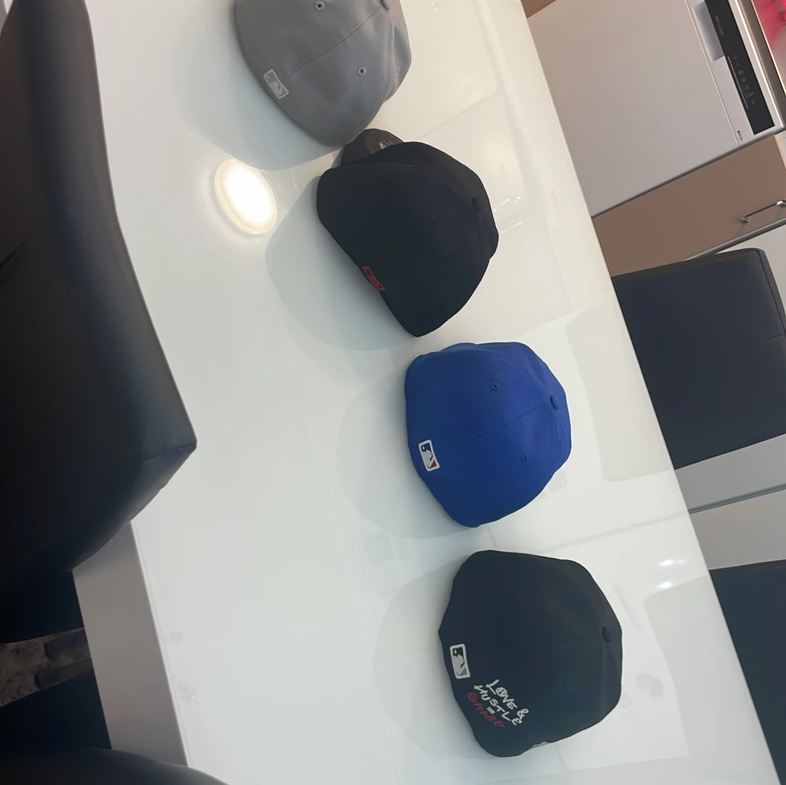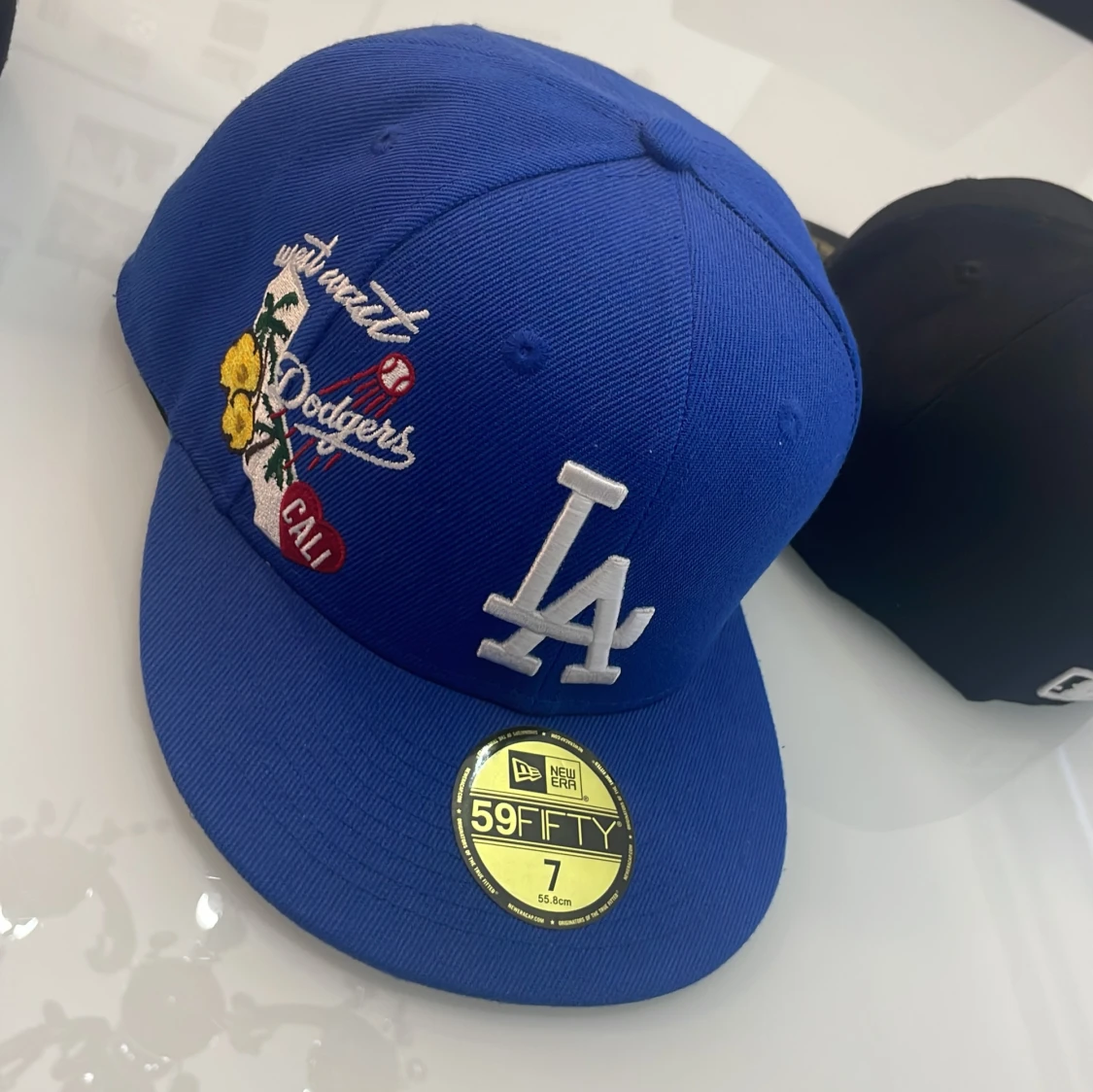 Säljer flera New Era kepsar med broderade logotyper. Grå keps med vit LA-logga, svart keps med röd NY-logga, svart keps med vit Sox-logga och hjärtdetalj, samt blå keps med vit LA-logga och färgglada broderier på sidan.