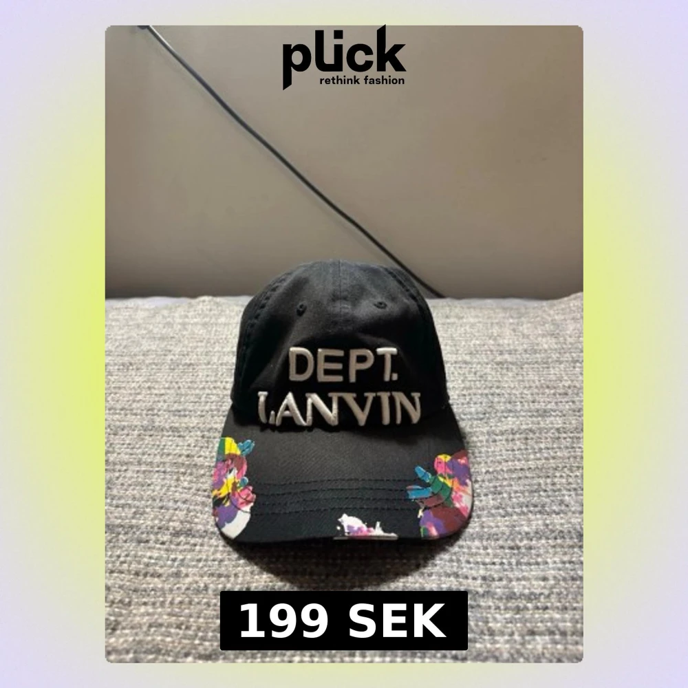 Säljer en svart keps från Lanvin x Gallery Dept i 100% bomull. Kepsen har broderad text framtill och färgglada tryck på skärmen. Justerbar rem bak med metallspänne där det står Lanvin. Riktigt snygg och unik accessoar.
