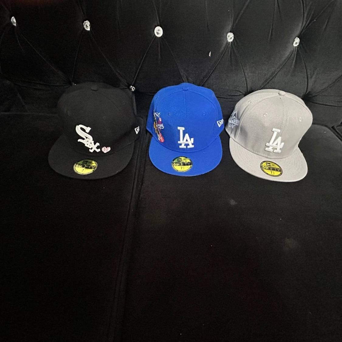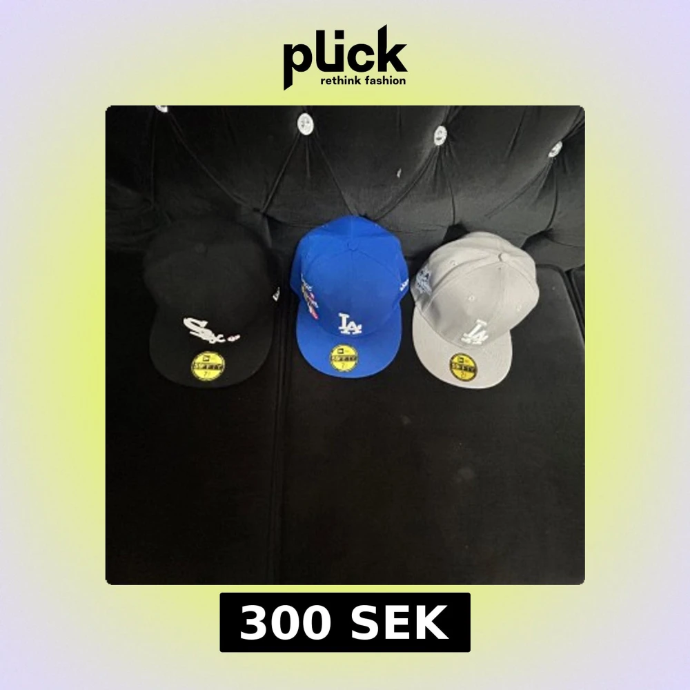 Säljer tre stilrena kepsar med broderade logotyper. En svart keps med vit logotyp och hjärtdetalj, en blå keps med vit logotyp och broderade detaljer, samt en grå keps med vit logotyp. Perfekta för att komplettera din streetwear-look.