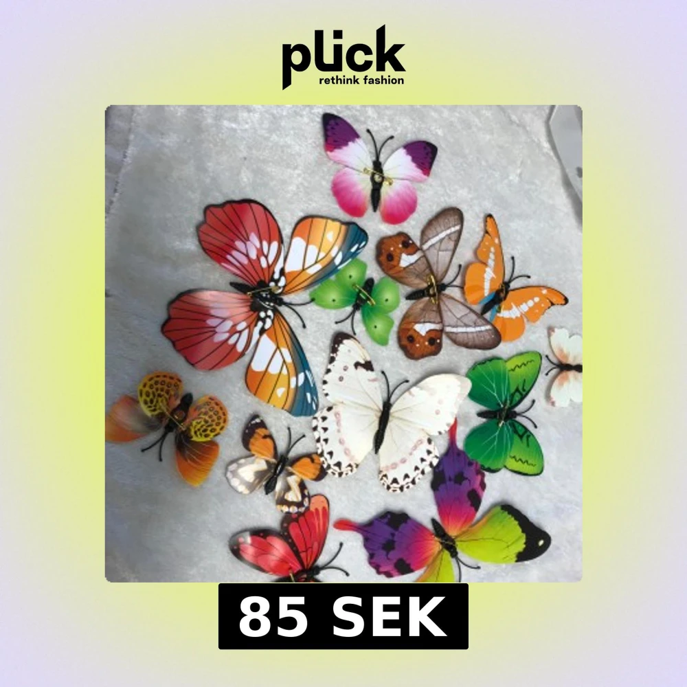 Säljer ett set med dekorativa fjärilar i plast i olika färger och mönster. Perfekta som accessoarer eller dekoration. 12st/paket . Mått ca 6.00*12.00 cm/st. 85kr/paket