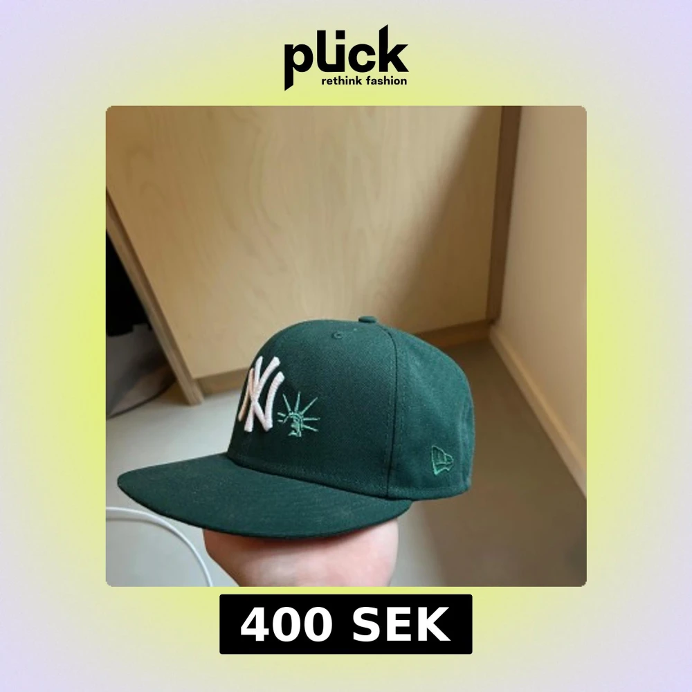 Säljer en mörkgrön keps från New Era med vit NY-logga och frihetsgudinnan broderad framtill. Undersidan av skärmen är ljusrosa. Klassisk 59FIFTY-modell, perfekt för dig som gillar streetwear.