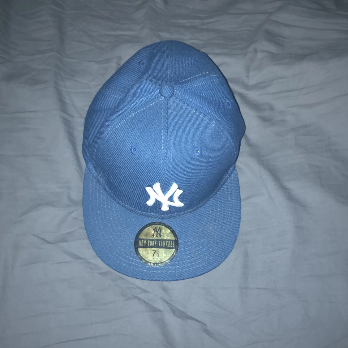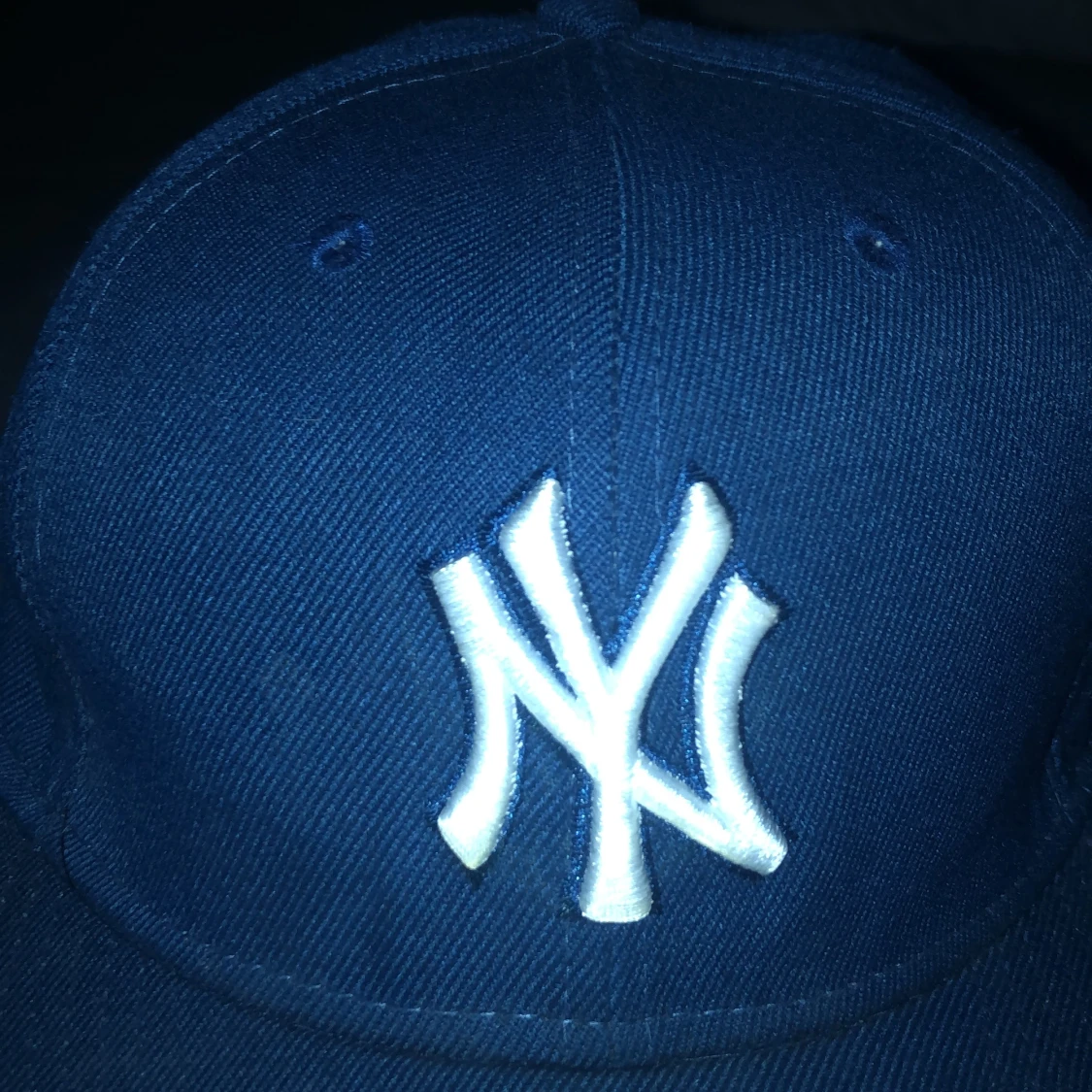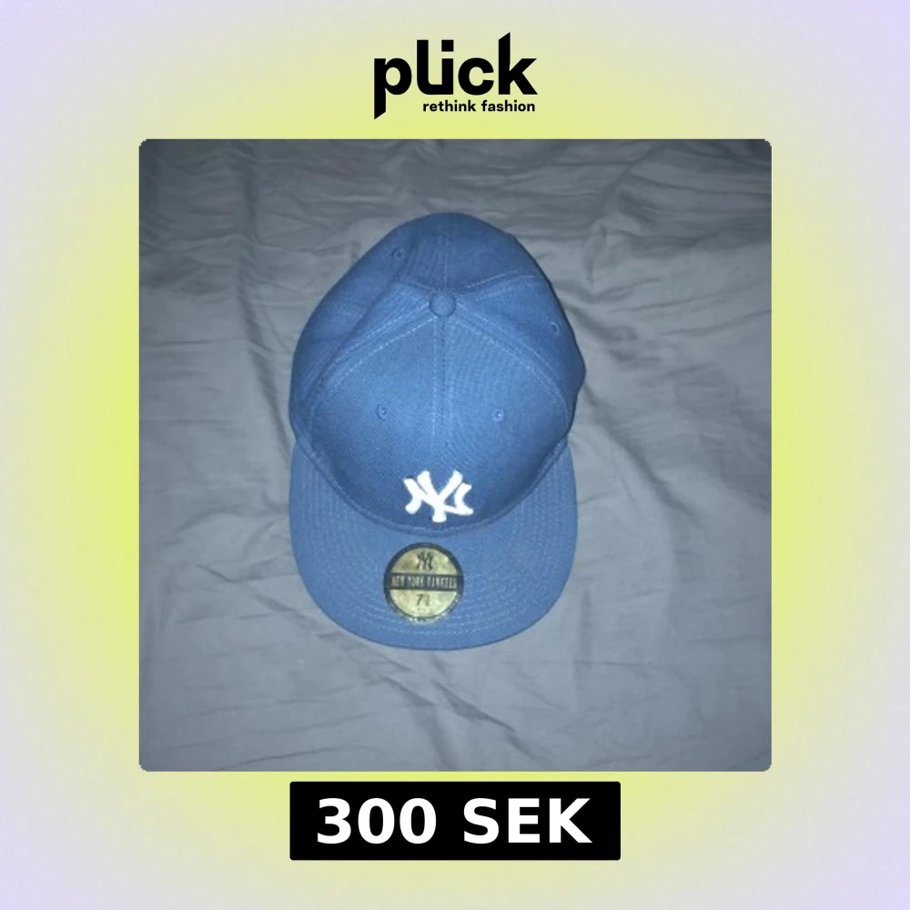 Säljer en blå New York Yankees keps med klassisk vit broderad NY-logga framtill. Kepsen är i basebollmodell med rak skärm och sticker ut med sin sportiga look. Märkt med officiell etikett på undersidan av skärmen och detaljer på insidan.