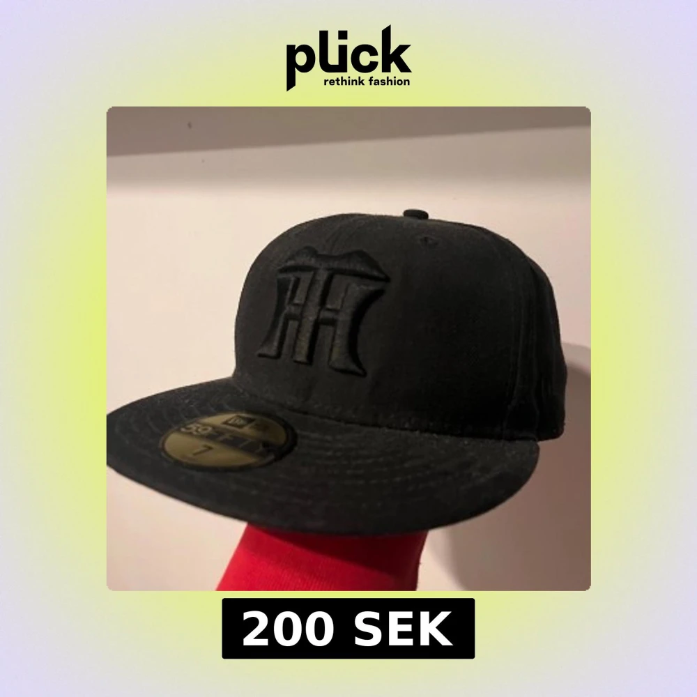 Säljer en svart keps från New Era 59FIFTY med broderad logga framtill. Klassisk modell med platt skärm och strukturerad passform. Perfekt för dig som gillar stilrena accessoarer.
