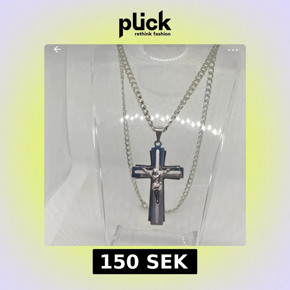 Stilrent halsband i silverfärg med ett stort kors som har en Jesusfigur på framsidan. Kedjan är grov och korshänget har en cool, modern design med flera lager och detaljer. Perfekt för dig som vill ha ett statement-smycke med religiös touch.