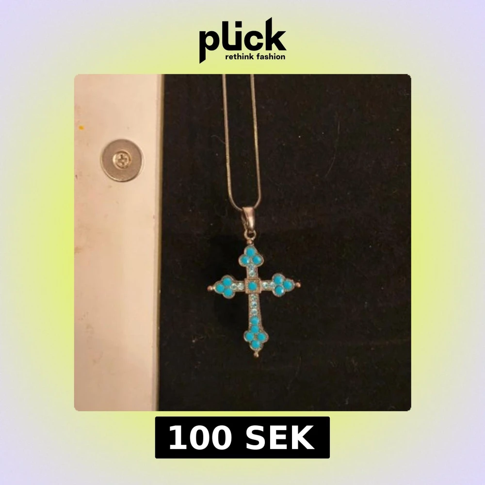 Halsband med ett korshänge dekorerat med turkosa stenar och silverdetaljer. Perfekt för att ge en färgklick till din outfit.