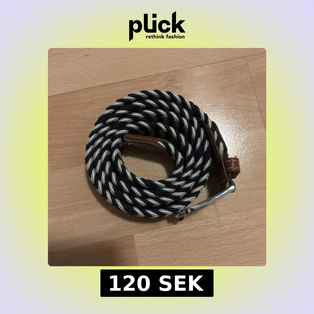 Säljer ett snyggt flätat bälte i blått och vitt med bruna läderdetaljer och silverfärgat spänne. Bältet har ett coolt mönster och passar perfekt till jeans eller chinos. Justerbar längd tack vare det flexibla materialet.