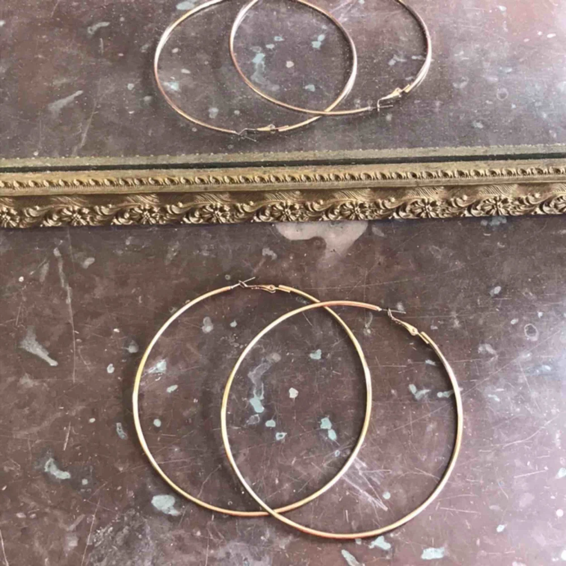 Jättestora guldfärgade hoops. Aldrig använt, ska vara okej även om man är allergisk mot nickel. Frakt tillkommer 😌🌼