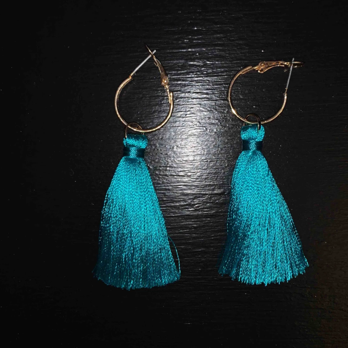 Turkosa tofsar på guldiga ringar. Aldrig använda.