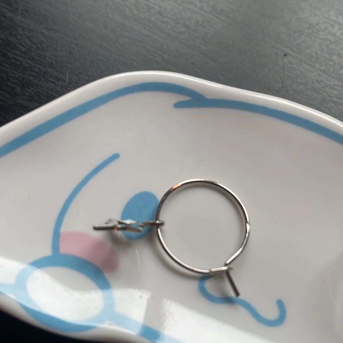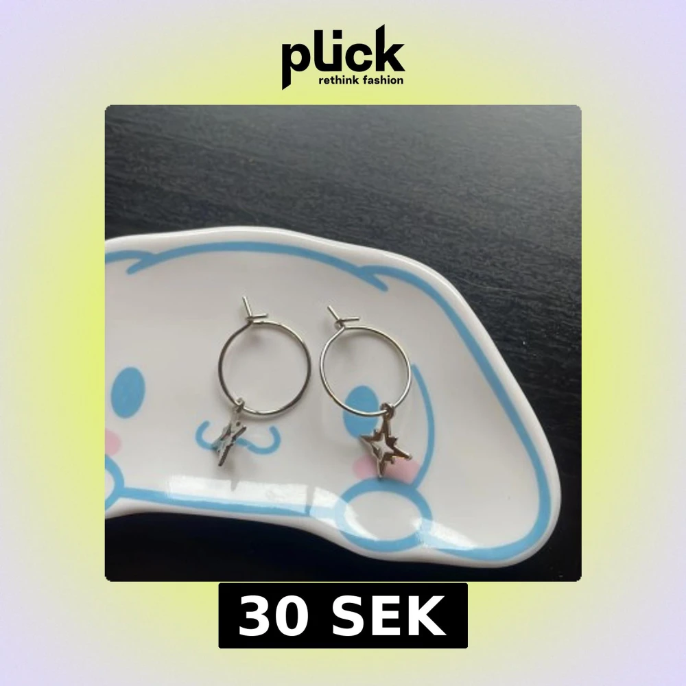 Ett par stilrena silvriga örhängen i ringmodell med hängande stjärnformad detalj. Aldrig användna har enbart haft på smyckestallrik, dock har ena en liten missfärgningsfläck (se bilaga 2) men som knappt syns när man har på dem! Frågor? Kom DM!
