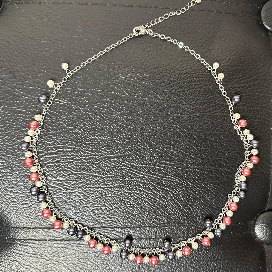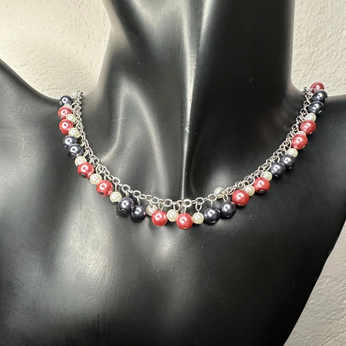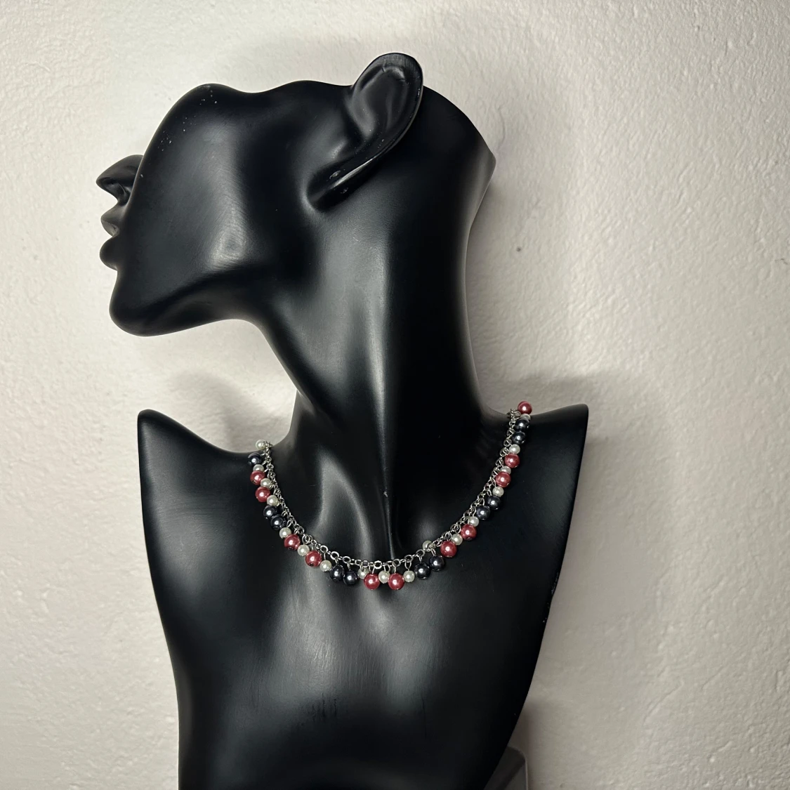Färgstarkt retro halsband från sent 1980- eller tidigt 1990-tal. Silverfärgad kedja med hängande imitationspärlor i mörkblått, vinrött och pärlvitt. Längd ca 47 cm + 5 cm förlängning. Perfekt att bära som blickfång till både vardags- och festoutfit. Prutning accepteras ej, men jag erbjuder bra rabatt vid köp av flera saker. Jag rensar smyckesskrin och garderob – kika gärna på mina andra annonser! ⸻