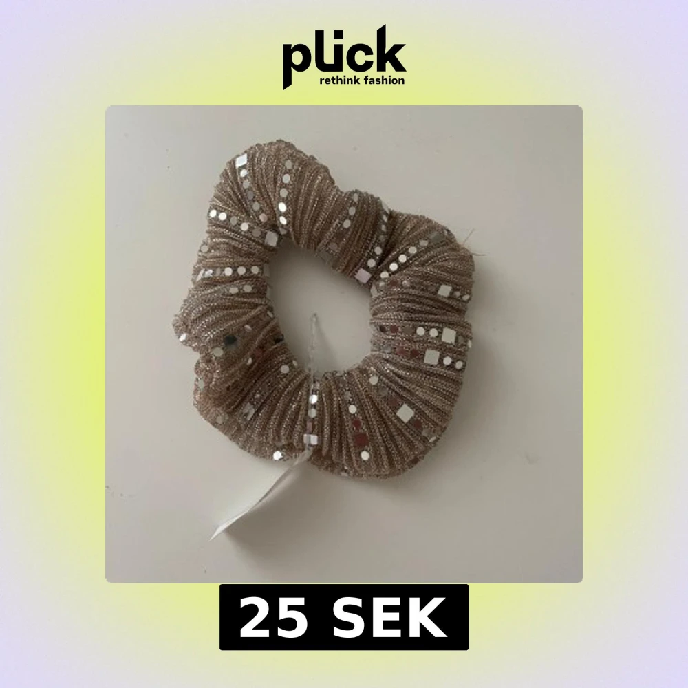 Superfin scrunchie i beige med glittrigt tyg och silvriga paljetter. Perfekt accessoar för att lyfta din frisyr med extra bling. Tjock och fluffig modell som ger volym till håret. Säljs med originaltag kvar. Aldrig använd och normal storlek!