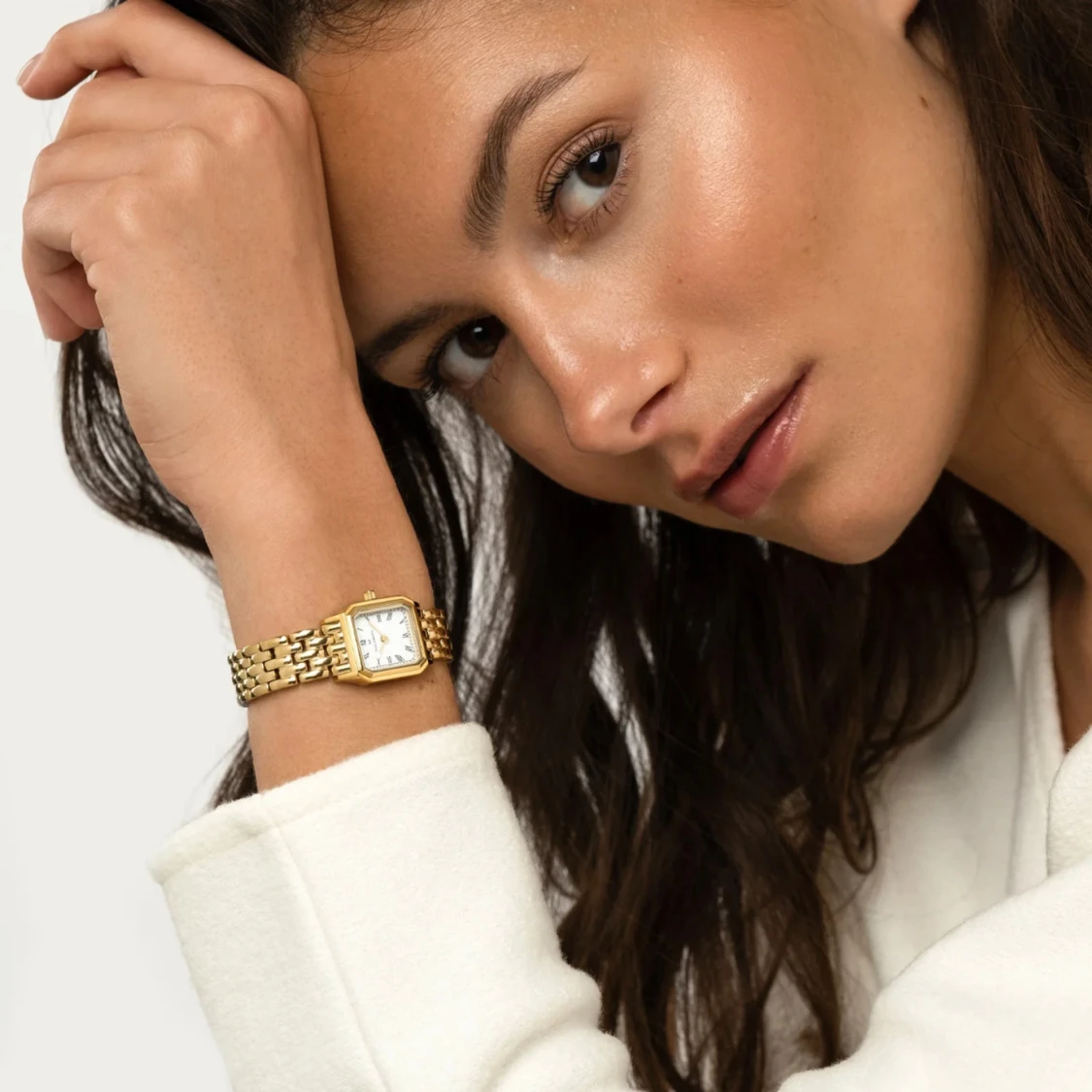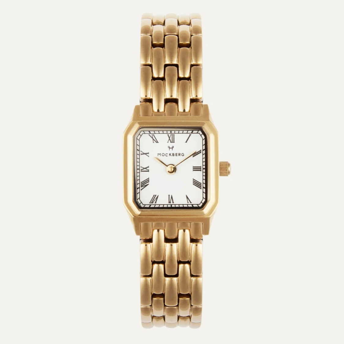 Stilren klocka från Mockberg i modellen classic med fyrkantig urtavla i vitt och romerska siffror. I helt nytt skick, använd typ en gång. Borttagna länkar på klockan men dem följer med vid köp, även klock asken nedkommer vid köpet!
