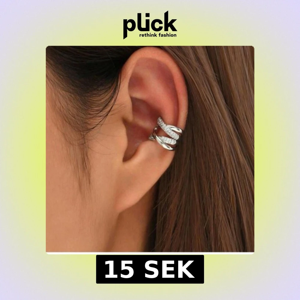 Snygg ear cuff i silverfärg med glittriga stenar. Designen är flätad med två rader av små kristaller och en slät rad som korsar över. Aldrig använts