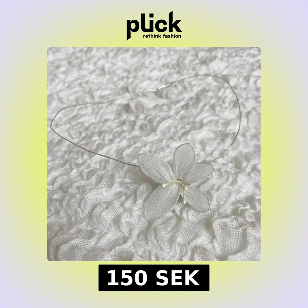 Ett elegant handgjort halsband med en tunn metalltråd och en vit tygblomma med pärldetaljer i mitten. Perfekt för att ge en romantisk och drömmig känsla till din outfit.