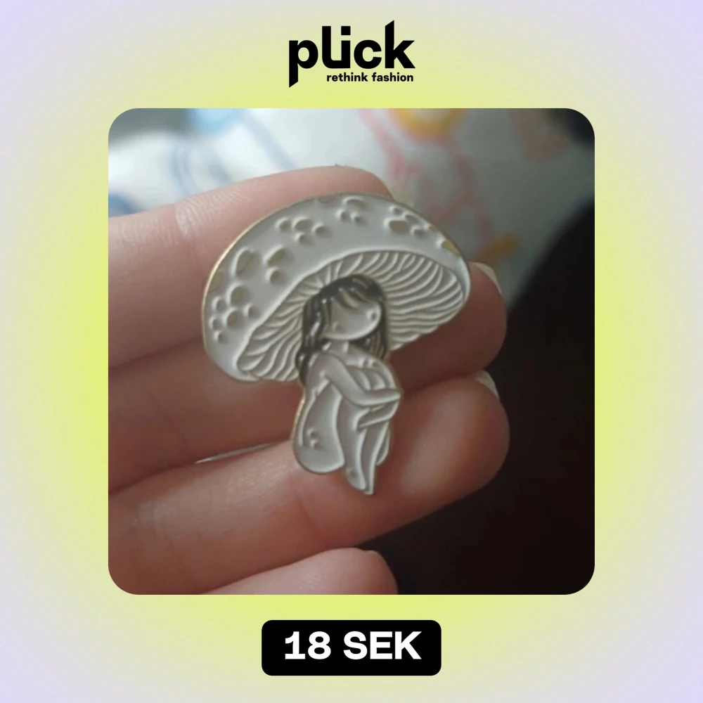 enamel pin badge of mushroom girl, bought at malmö scifi con 2023