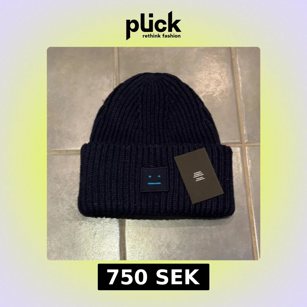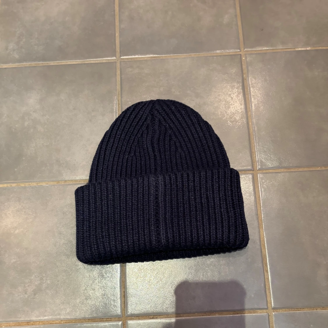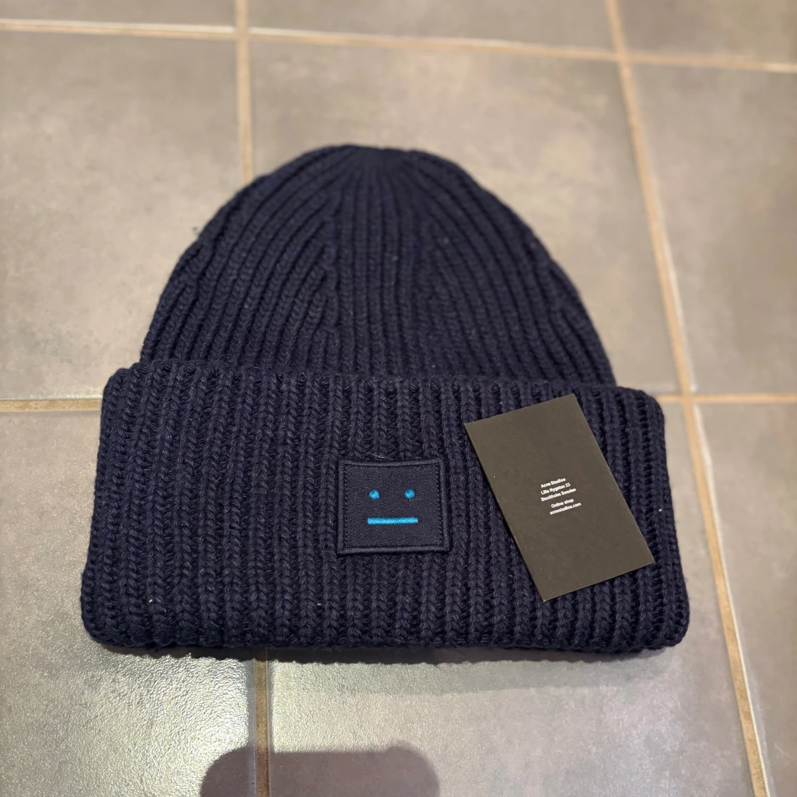 Snygg mörkblå ribbstickad mössa från Acne Studios med klassisk emoji-patch framtill i blått. Mössan har bred uppvikt kant och är tillverkad i mjukt stickat material som håller dig varm. Perfekt för dig som gillar stilrena accessoarer med en twist.