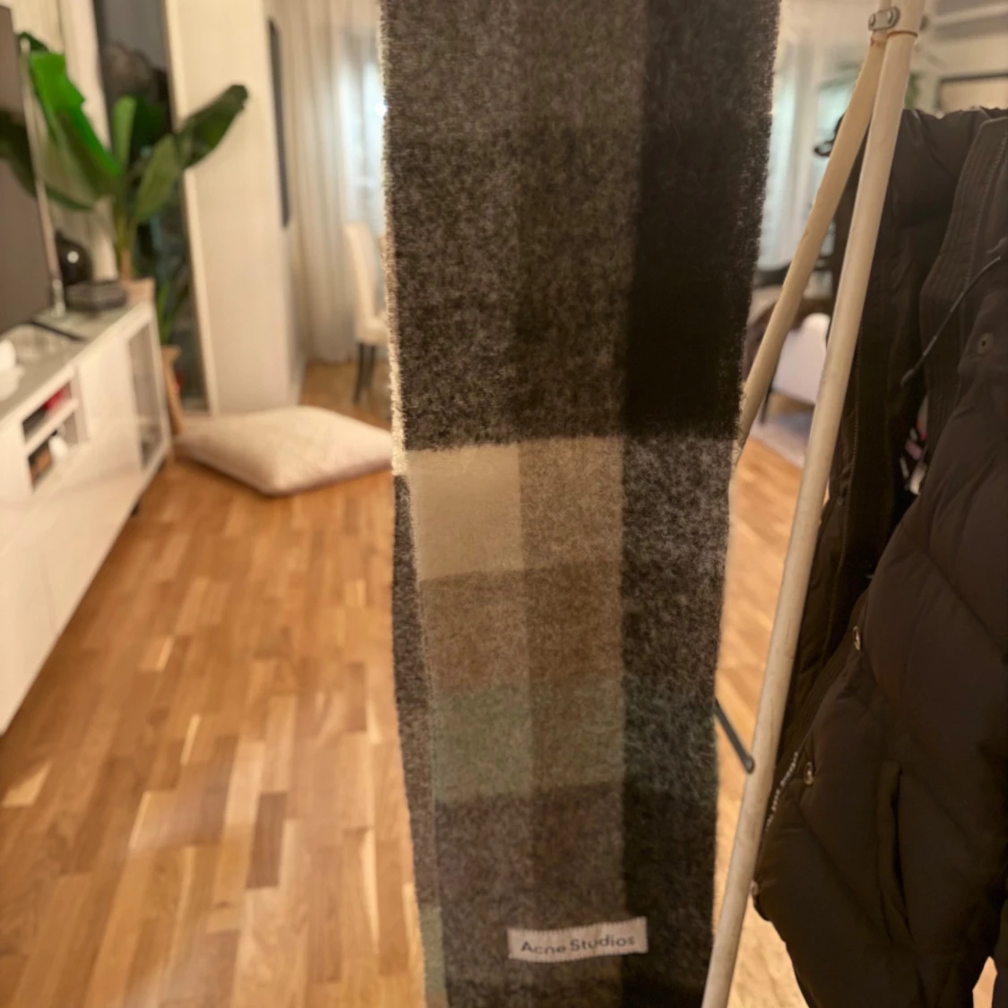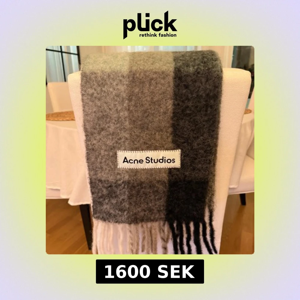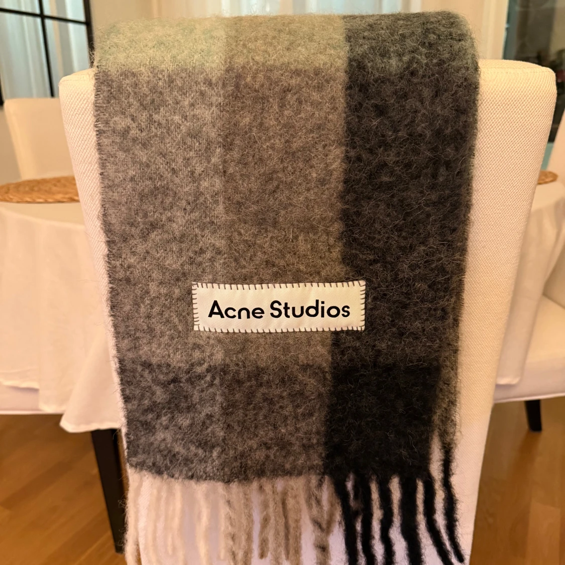 Supermjuk och fluffig halsduk från Acne Studios i rutigt mönster med olika nyanser av grått, svart och ljusgrön. Stor logotyp framtill och långa fransar i ändarna.