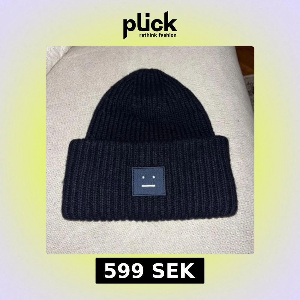 Snygg mörkblå ribbstickad mössa från Acne Studios med det klassiska ansiktsloggan framtill. Perfekt för kalla dagar och ger en clean look. Materialet är mjukt och värmande ull. Passar dig som gillar stilrena accessoarer.