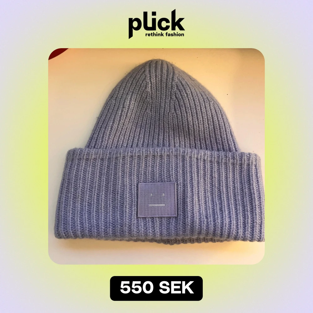 Säljer en superfin ljusblå stickad mössa från Acne Studios. Den är i 100% ull och har en ribbad design med en liten etikett framtill. Perfekt för att hålla sig varm och stilren under höst och vinter. Mössan är i mycket bra skick och passar de flesta tack vare one size-storleken.