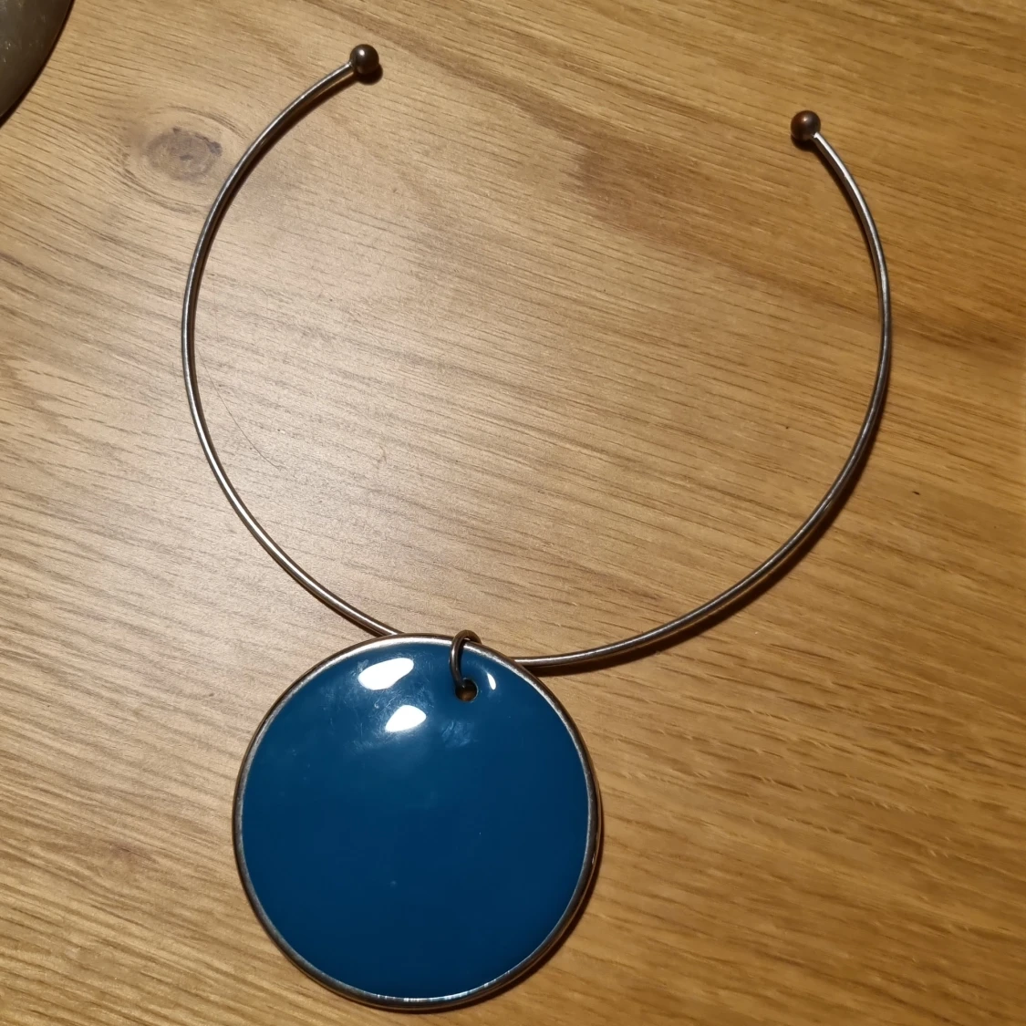 Stelt halsband med blågrönt hänge. Lite slitage på halsringen i färgen