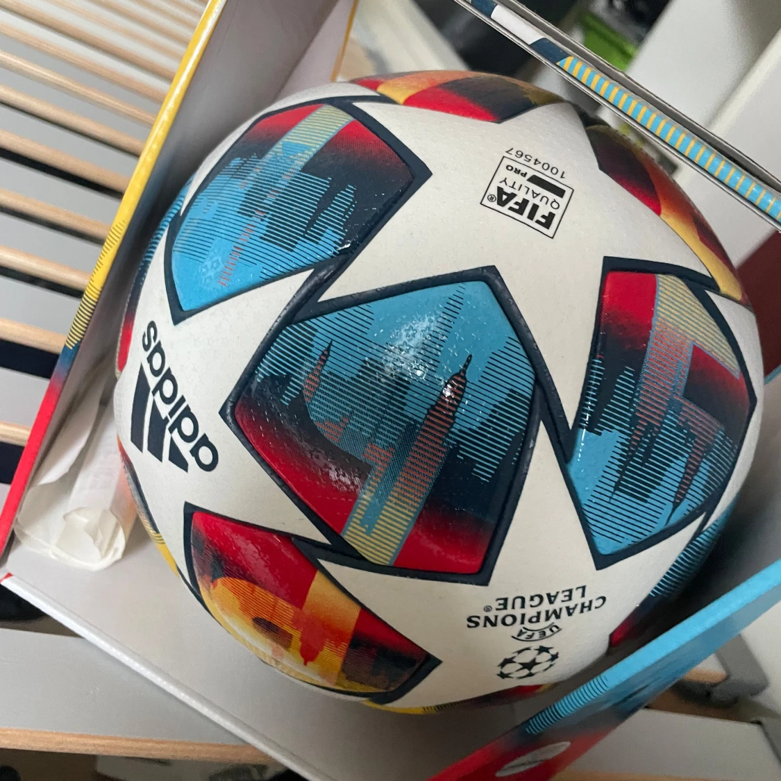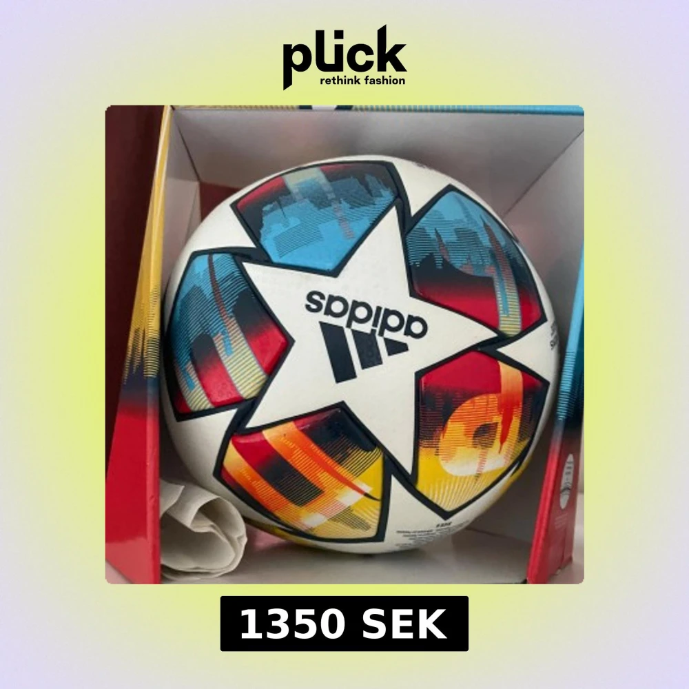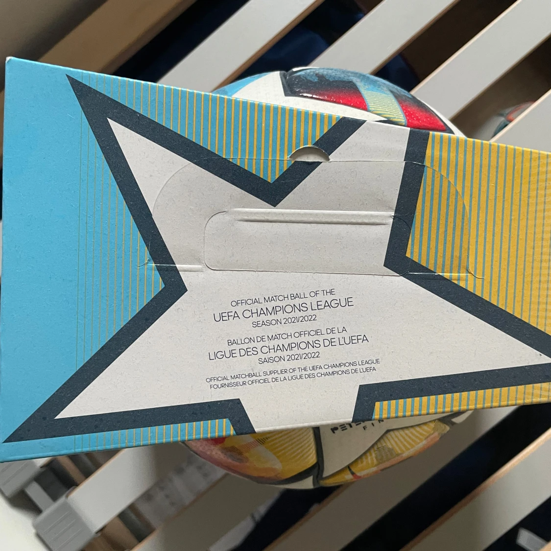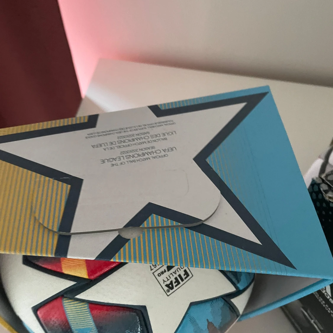 Säljer en officiell matchboll från UEFA Champions League säsongen 2021/2022. Bollen är vit med färgglada detaljer i blått, rött och gult samt stora stjärnmönster. Adidas-logga och Champions League-märke syns tydligt.