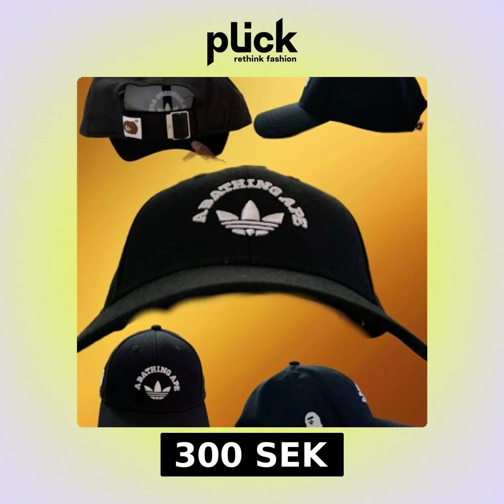 Svart keps med böjd skärm och broderad vit logga framtill där det står 'A Bathing Ape' och Adidas treklöver. Justerbar rem baktill med metallspänne och BAPE-etikett. Har använt 2-3 gånger men inte riktigt min stil.