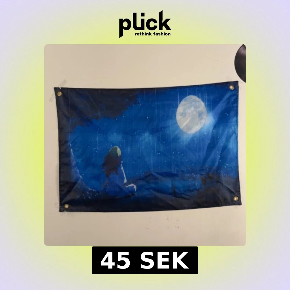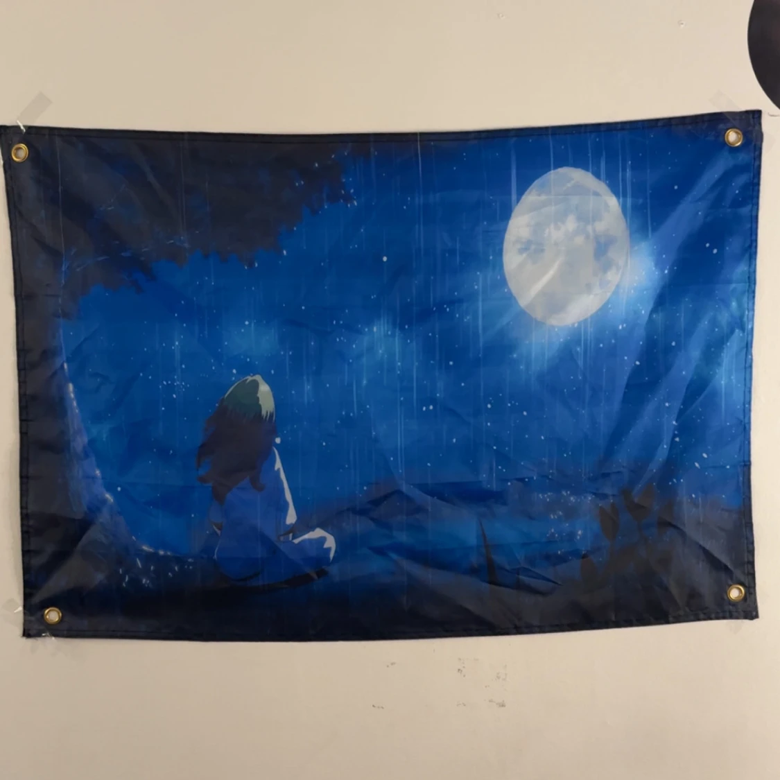 Denna produkt är en väggbonad eller tygposter med ett anime-inspirerat motiv av en person som sitter under ett träd och tittar på månen. Färgerna är djupblå och motivet ger en lugn, nattlig känsla. Produkten har öljetter i hörnen för enkel upphängning. Inga synliga defekter eller slitage.