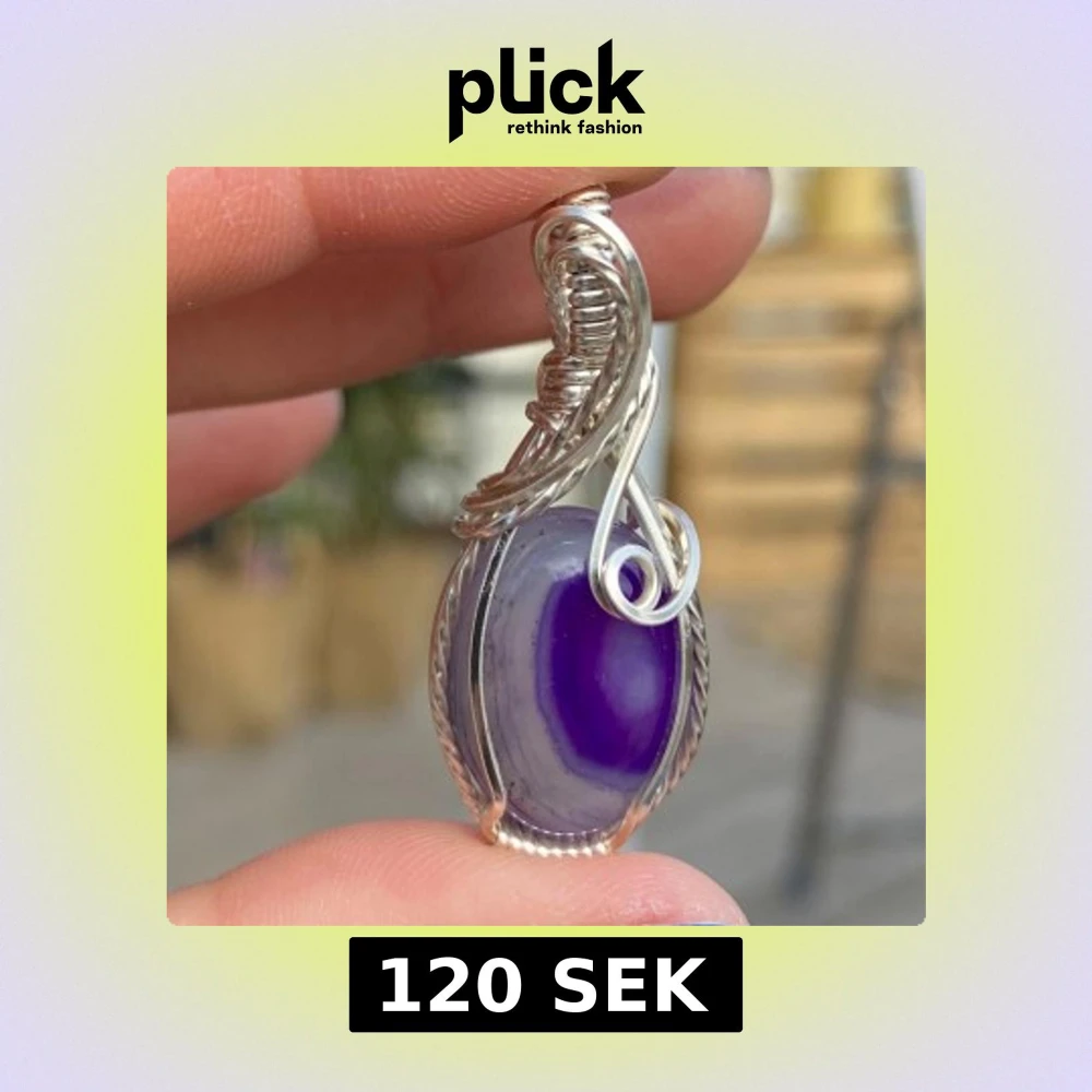 Unikt halsband med en oval lila agat infattad i intrikat lindad silvertråd. Stenen har vackra skiftningar i lila och grått, och infattningen har snygga snirkliga detaljer som ger ett handgjort och konstnärligt intryck. Perfekt statement piece för dig som gillar färg och unika smycken.