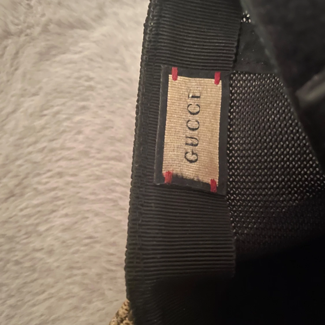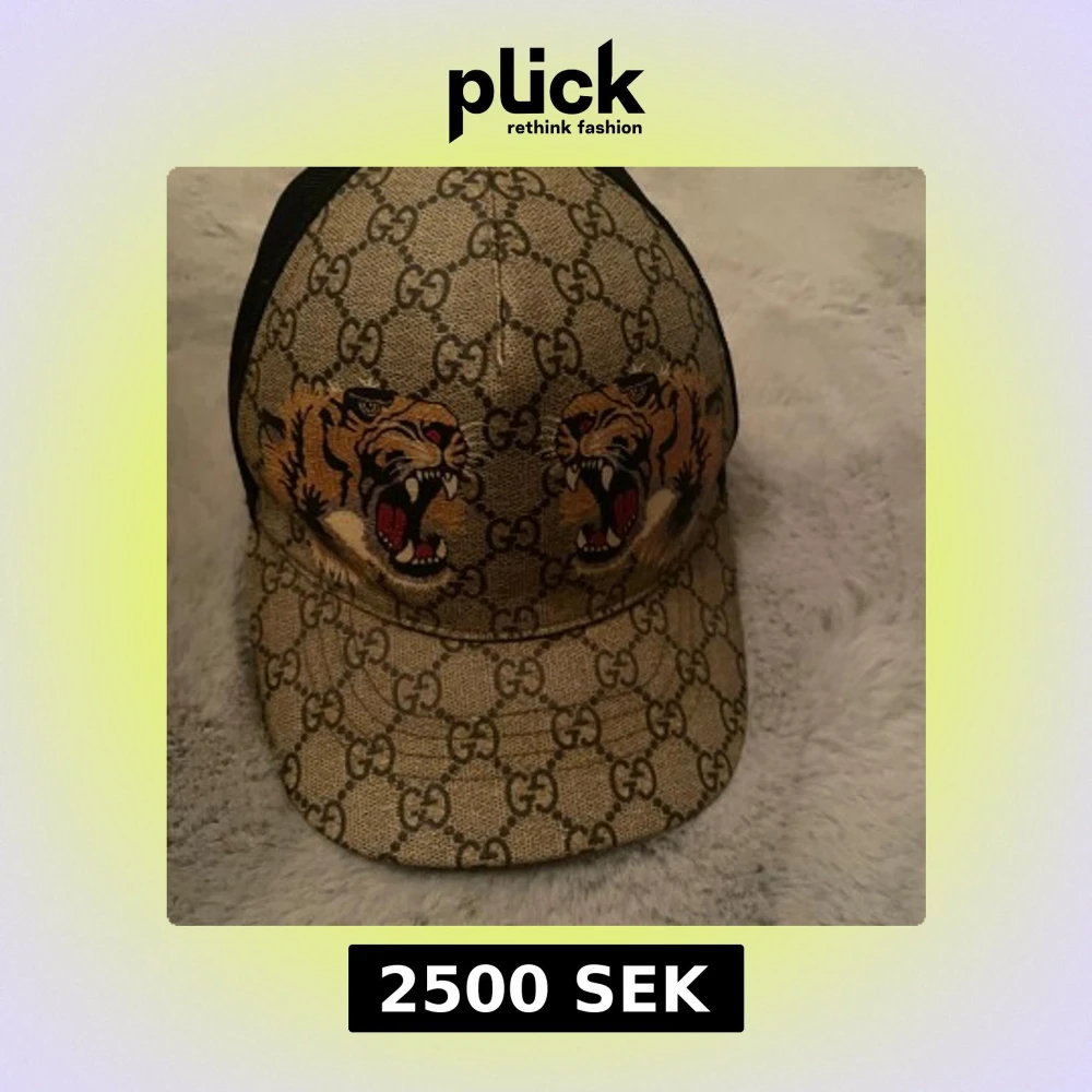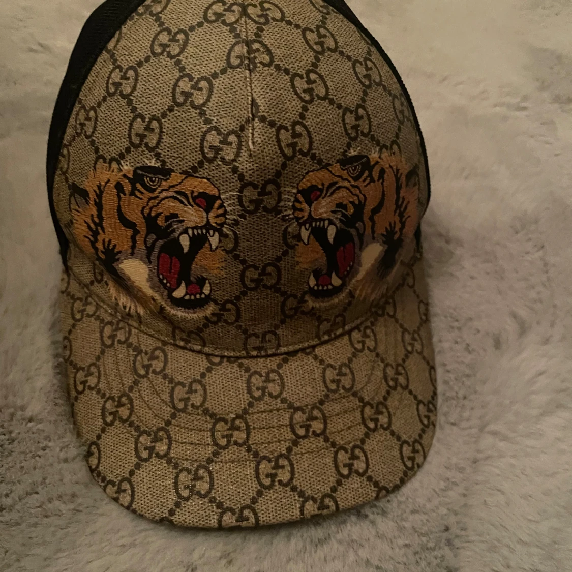 Säljer en snygg Gucci keps med ett coolt tigertryck. Kepsen har det klassiska GG-mönstret i beige och brunt. Perfekt för att ge din outfit en lyxig touch. Tillverkad i Italien med högkvalitativa material.