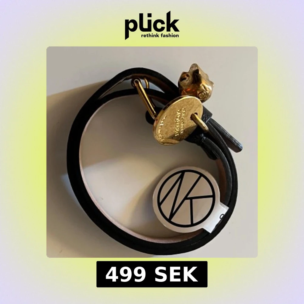Svart smalt läder armband i skinn från Alexander McQueen med guldfärgat spänne och detaljer. läder armbandet har en ikonisk dödskalleberlock och en rund medaljong med ingraverad text. Perfekt accessoar för att lyfta din outfit med en edgy touch. Skick 7,5/10 original pris ligger på cirka 1900 - 1500kr.