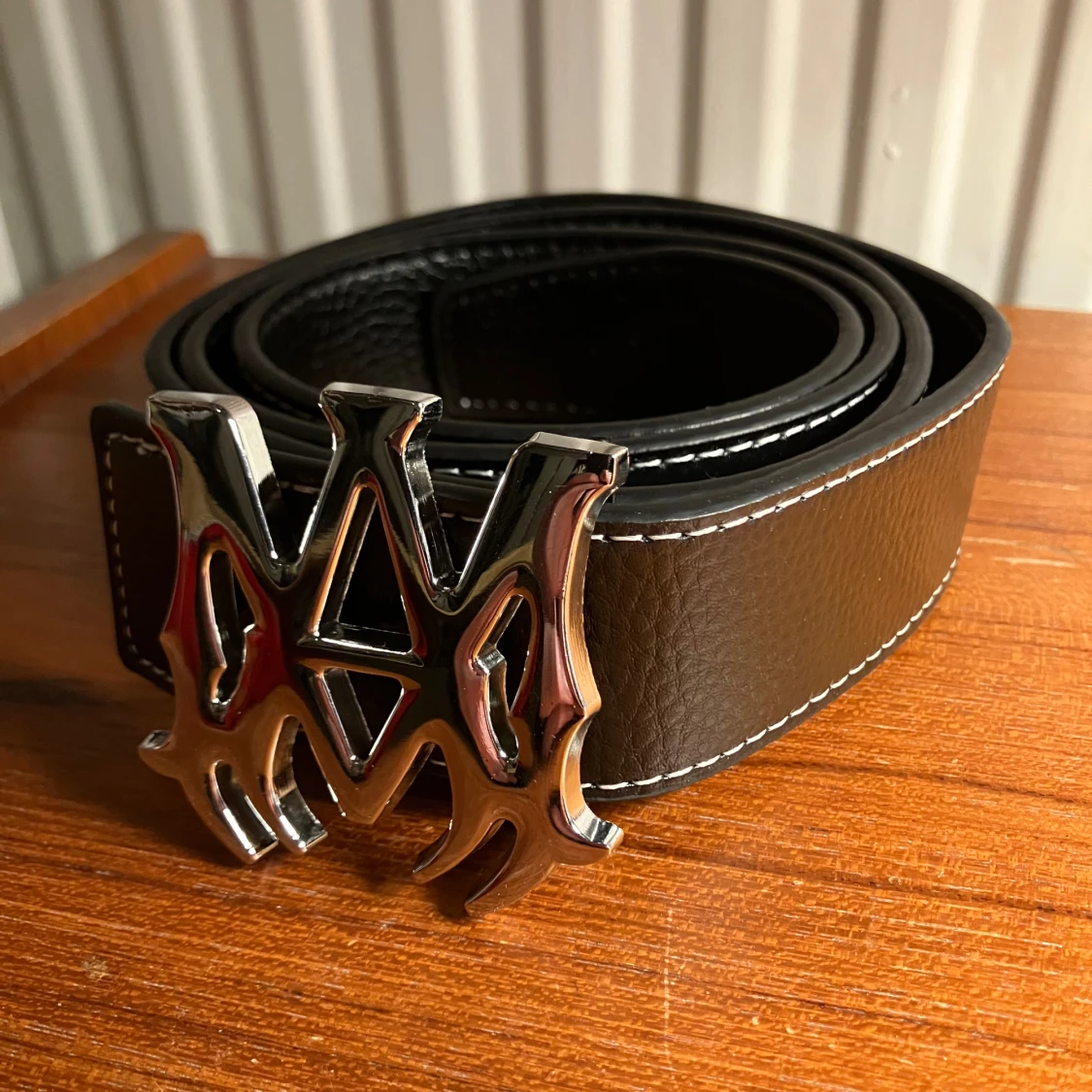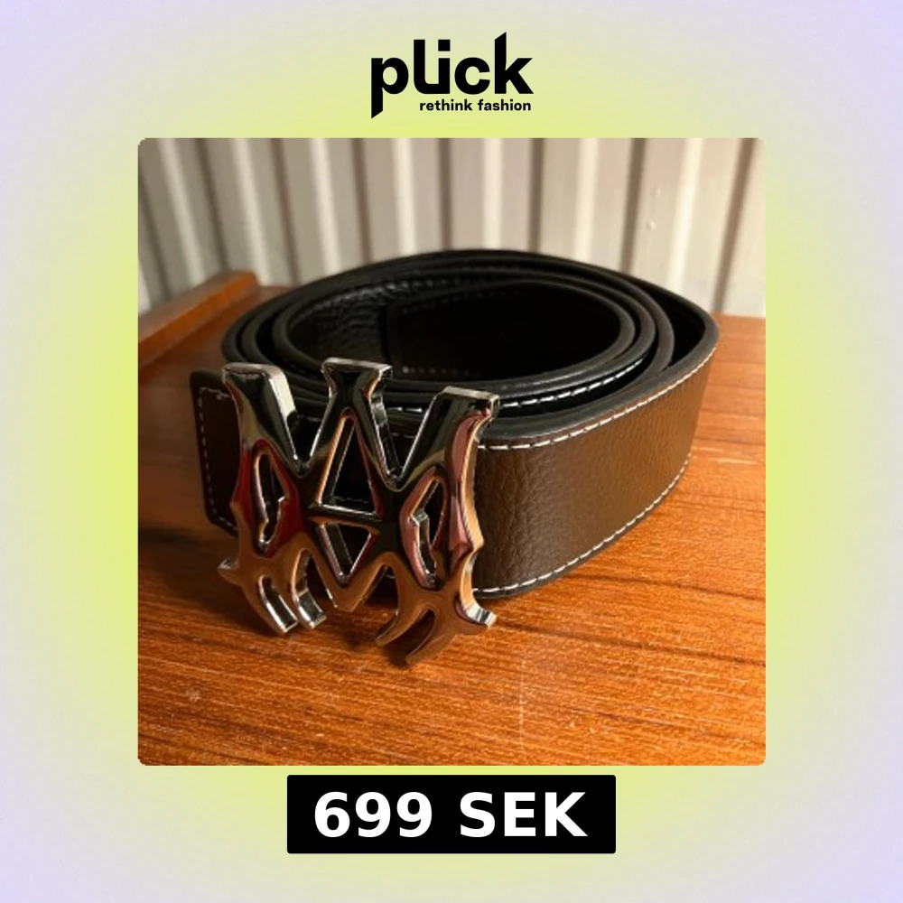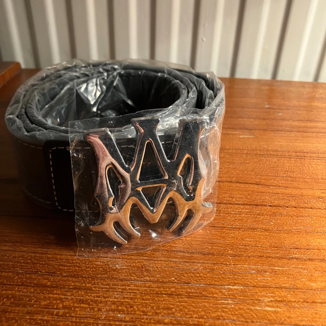 Säljer ett svart bälte från Amiri med grov textur i skinn och vit kontrastsöm längs kanterna. Bältet har ett stort, unikt silverspänne med Amiris ikoniska M-design som verkligen sticker ut. Perfekt för dig som vill ha en statement-accessoar. Helt ny!