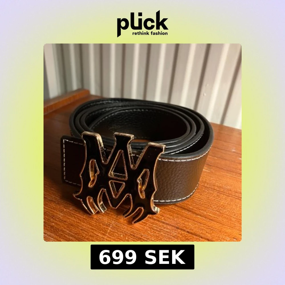 Säljer ett svart Amiri bälte i skinn med grov textur och vita sömmar längs kanterna. Spännet är stort, guldig-design med svarta detaljer. Perfekt för att ge outfiten en unik och edgy touch. Helt nytt!