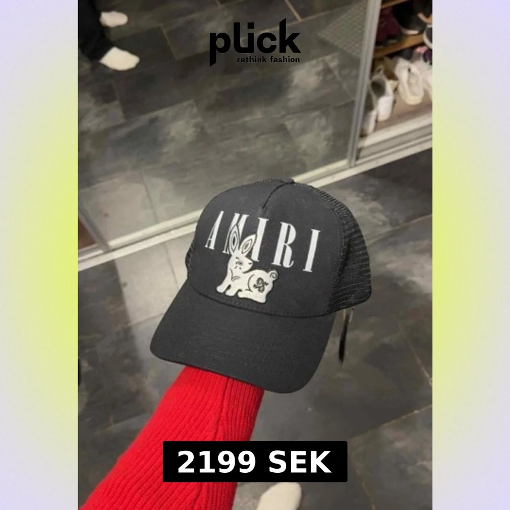 Snygg svart truckerkeps från Amiri med vit logotyp och en broderad kanin på framsidan. Kepsen har mesh på sidorna och bak, samt justerbar snapback för perfekt passform.