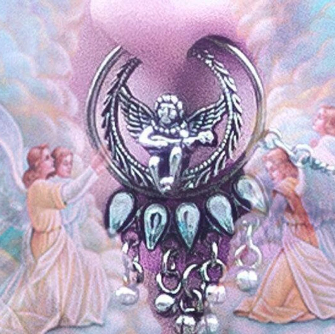 Handgjort smycke med ängel i nickelfritt stål. Mjuka silikontoppar istället för piercing Skick - ny. Tillverkas på beställning